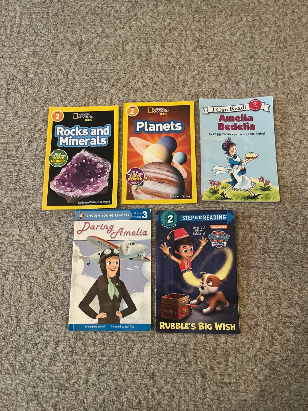 Selling a set of gently used kids' books! Includes National Geographic Kids 'Rocks and Minerals' and 'Planets', 'Amelia Bedelia', 'Daring Amelia', and 'Rubble's Big Wish' from Paw Patrol. Great for young readers!