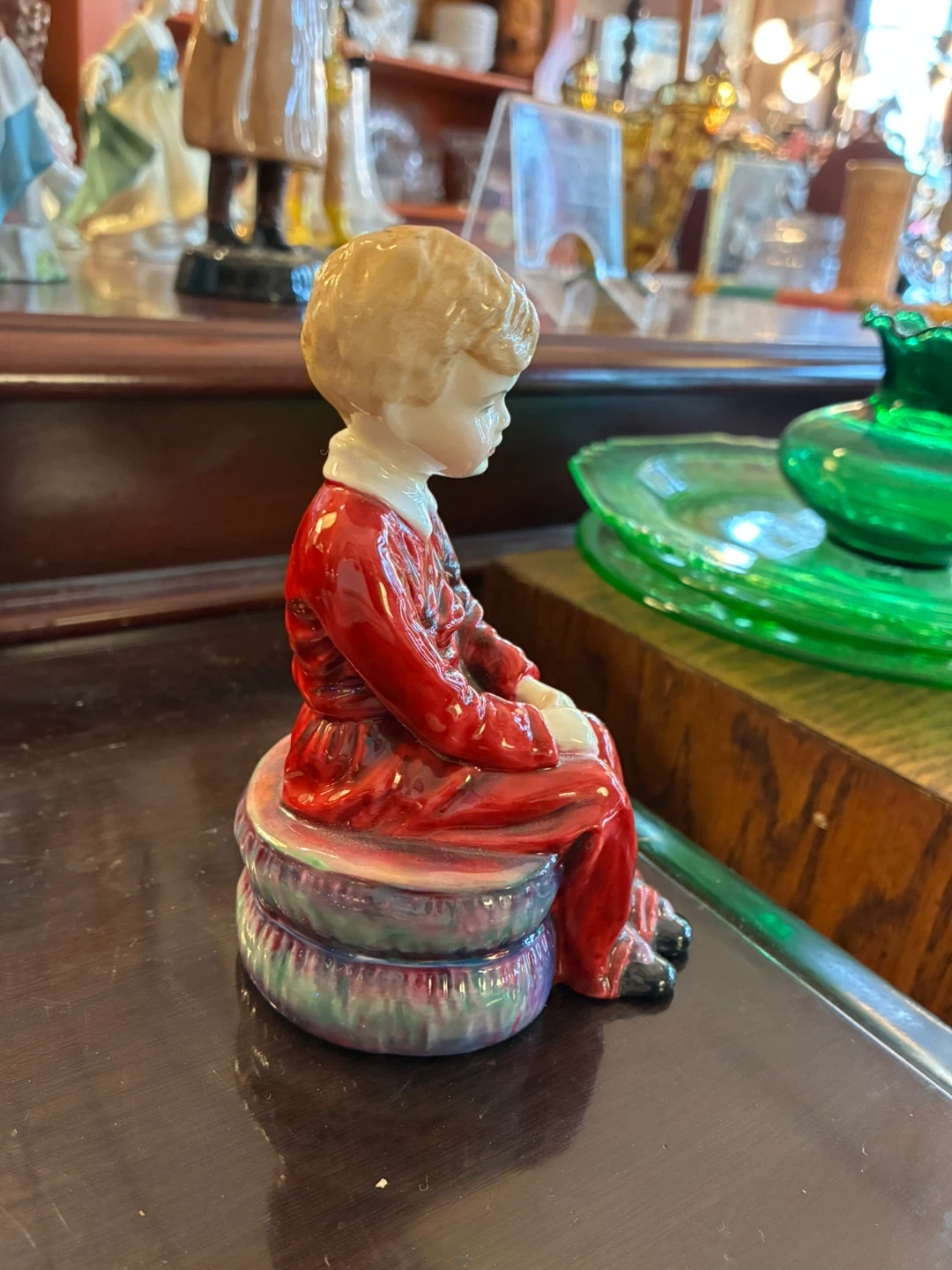 Here's a lovely Paragon Fine Bone China figurine! It features a boy in a red outfit sitting on a stack of books. It's a charming piece for any collector