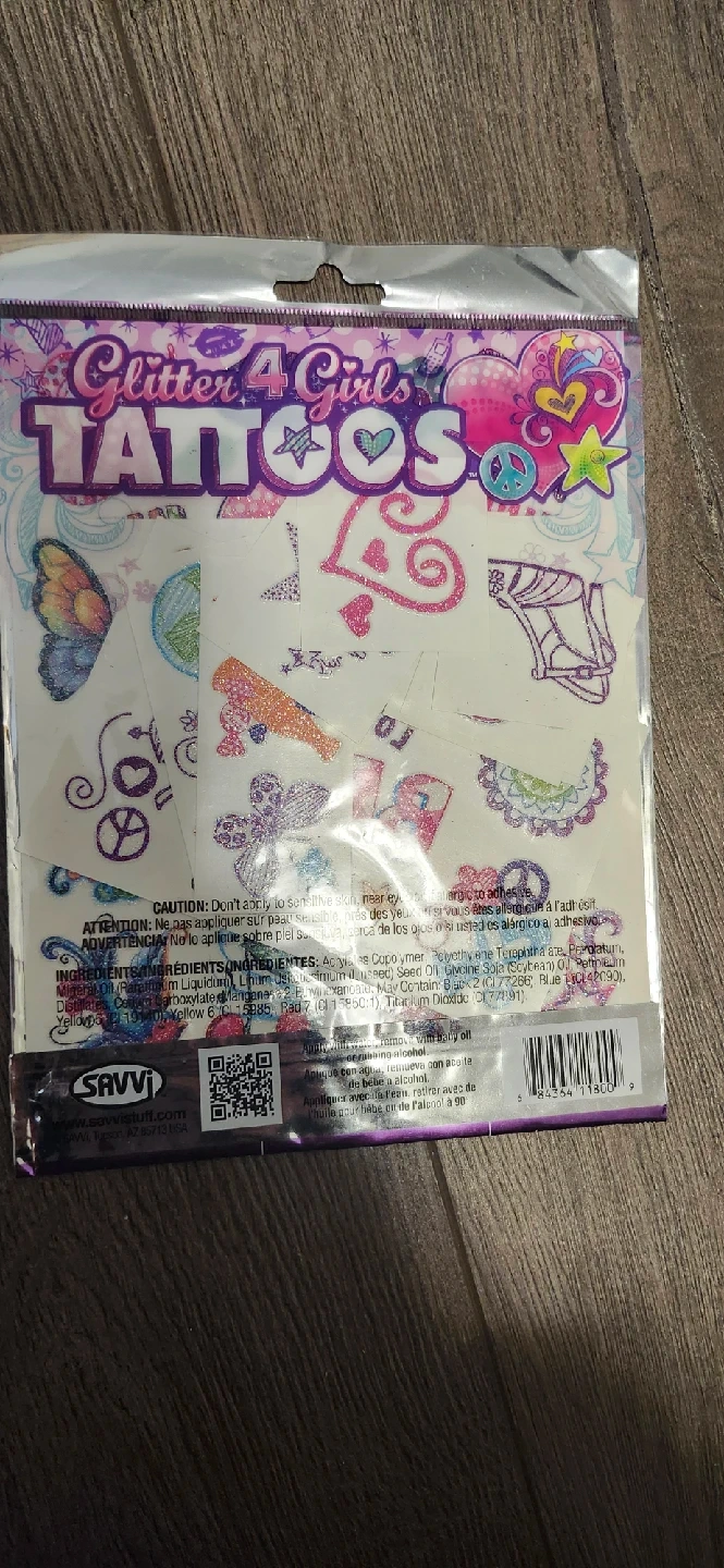 Two packs of temporary tattoos! One is Body Prints temporary tattoos with a unicorn design. The other is Savvi Glitter 4 Girls Tattoos with over 50 tattoos in the pack