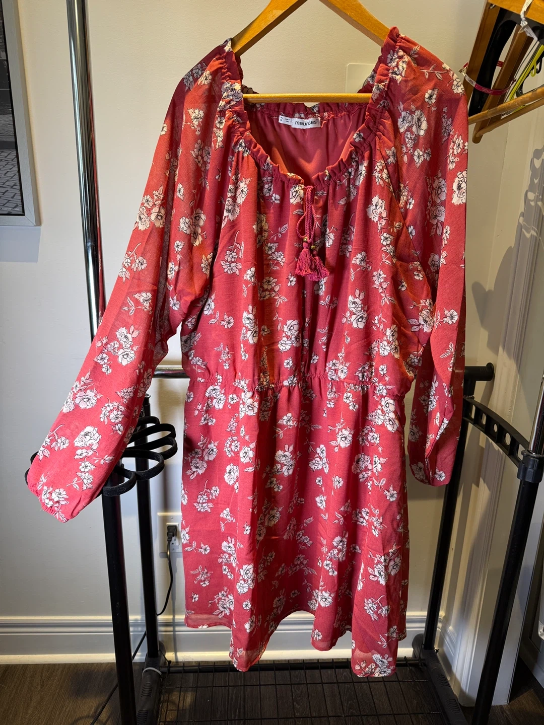 Selling a lovely floral dress from maurices! It's a size 2 and features a beautiful pinky/red and white floral pattern. Perfect for a casual day out or a summer evening night out. It's like new and ready for a new home!