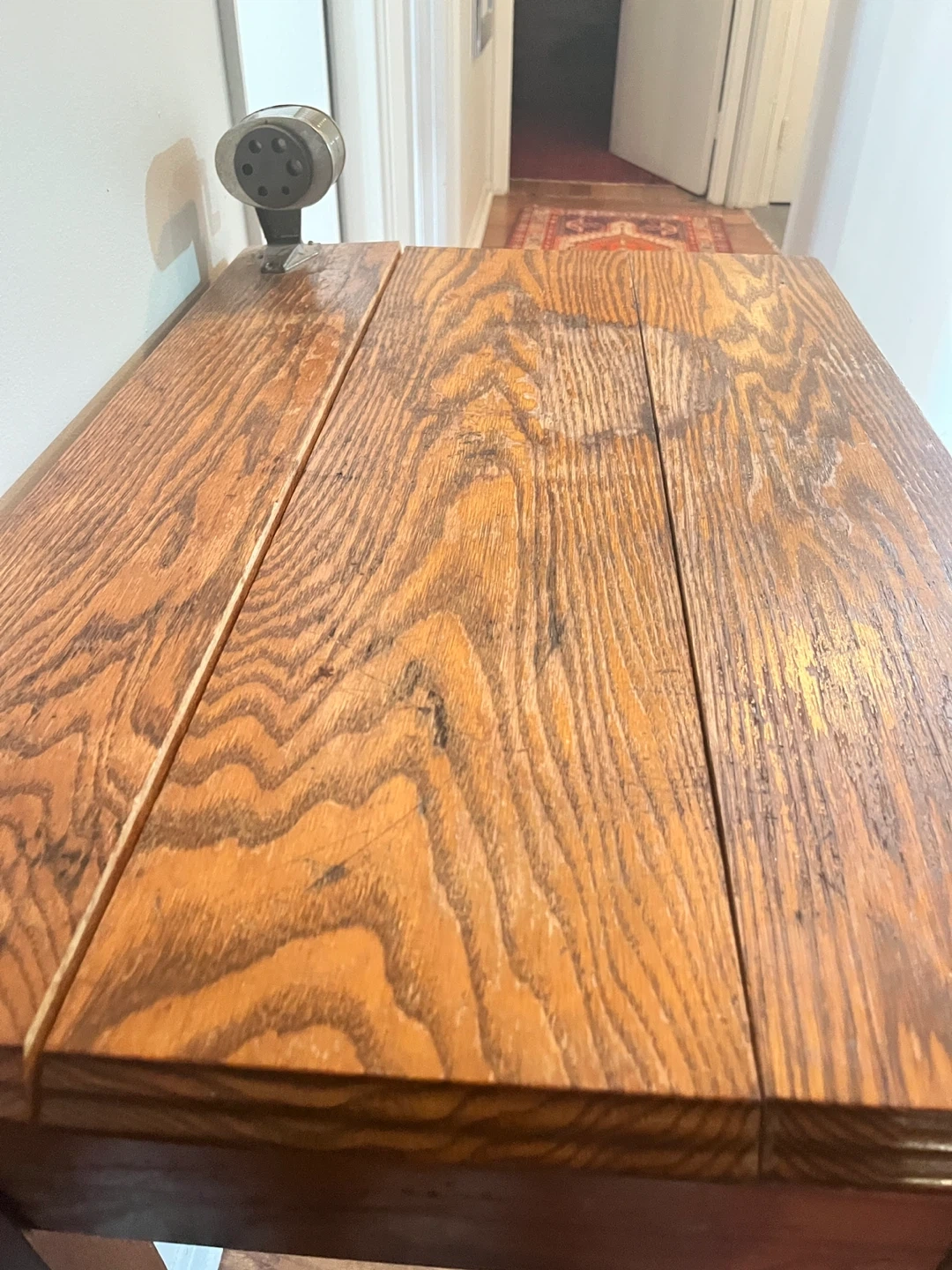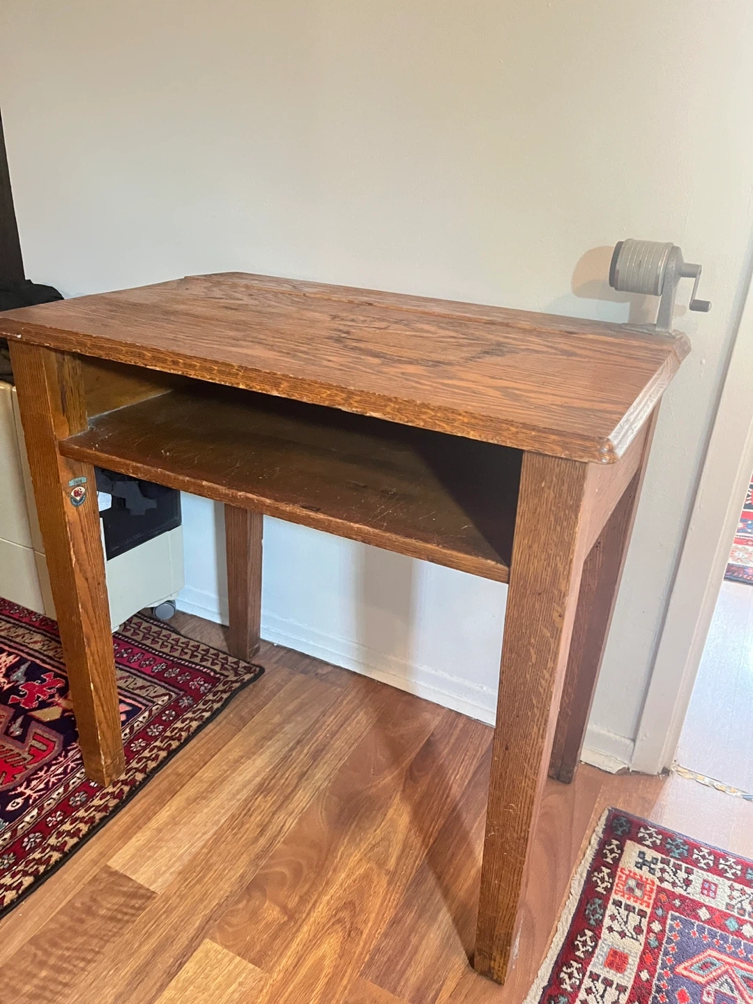 I'm selling a vintage desk with a CBC Radio Canada logo. It has a nice wooden finish and a unique charm. Perfect for a study or workspace! Top could use some repair as a piece is a little loose. Price reflects that condition.