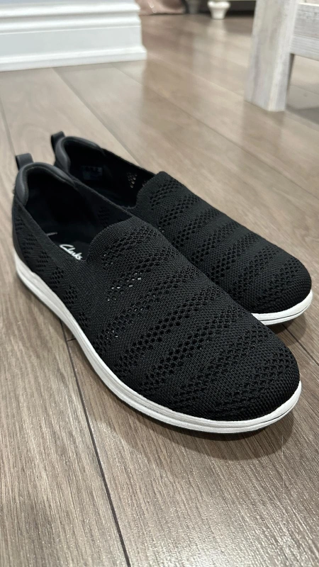 Selling a pair of Clarks Cloudsteppers slip-on shoes in black! These are super comfy and in great condition. They come with the original box too! Perfect for everyday wear. These shoes are brand new and have new been worn.