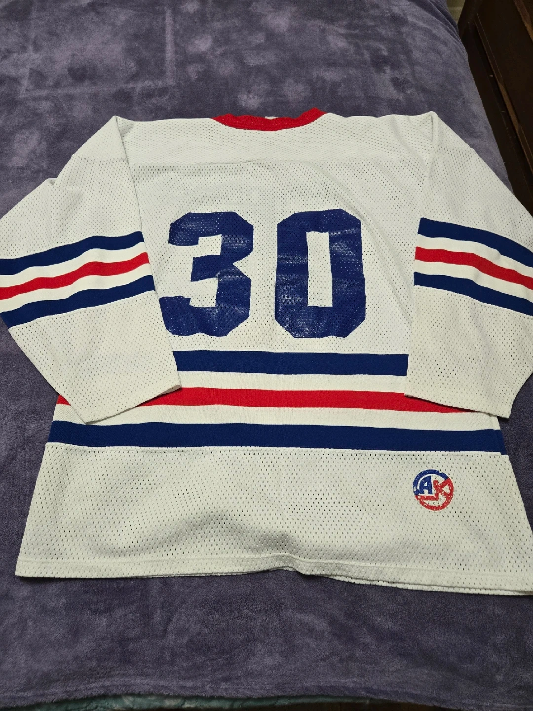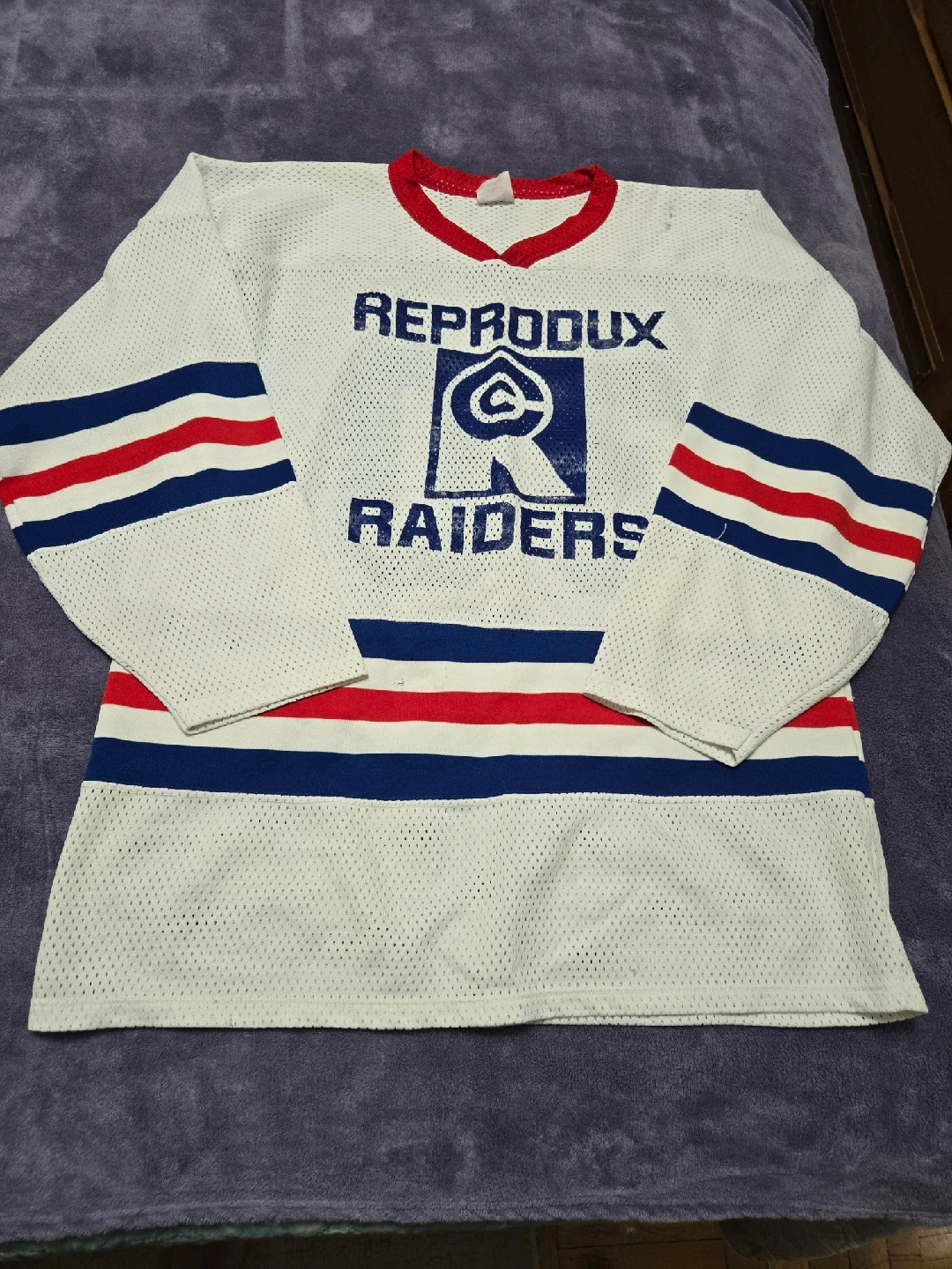 94Selling a vintage Koho hockey jersey! It's a white jersey with red, white, and blue stripes, and the number 30 on the back. It has the Reprodux Raiders logo on the front.