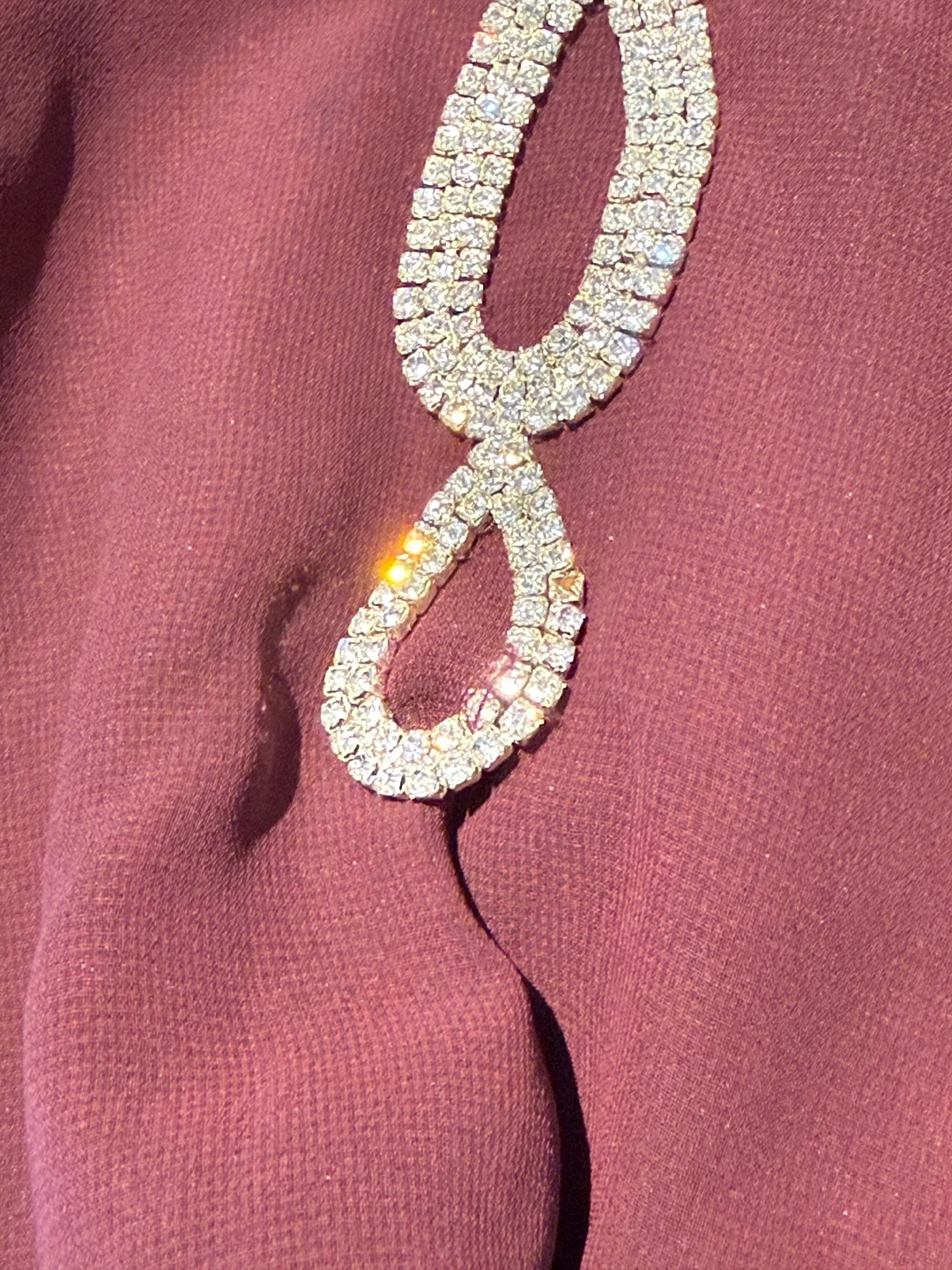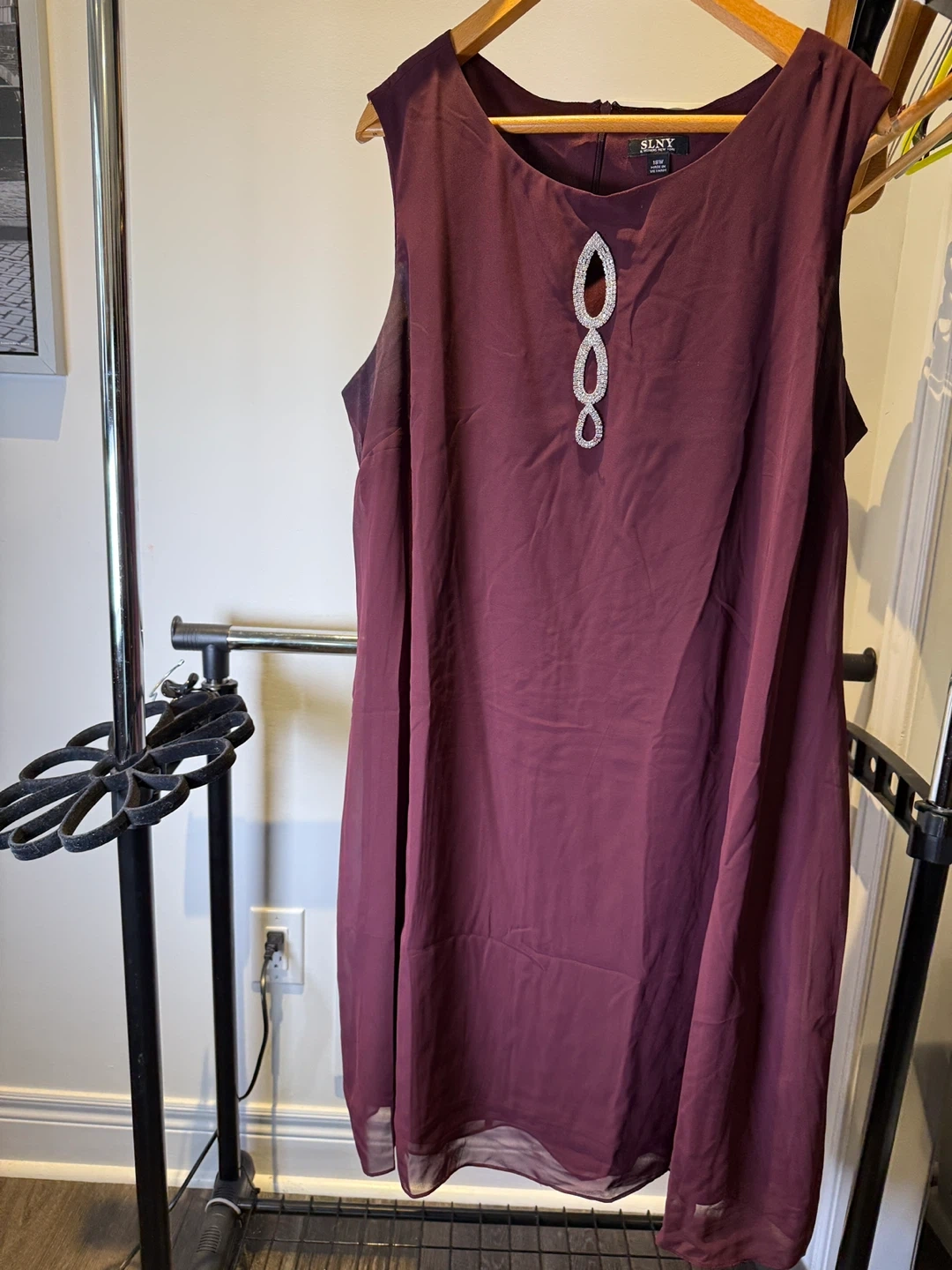 Selling a lovely SLNY dress in a beautiful burgundy colour! It's a size 18W. There is some deodorant marks in the under arm area and one jewel missing/damaged. The shawl has spots for your arms so it is worn not just draped. Still lots of life left!