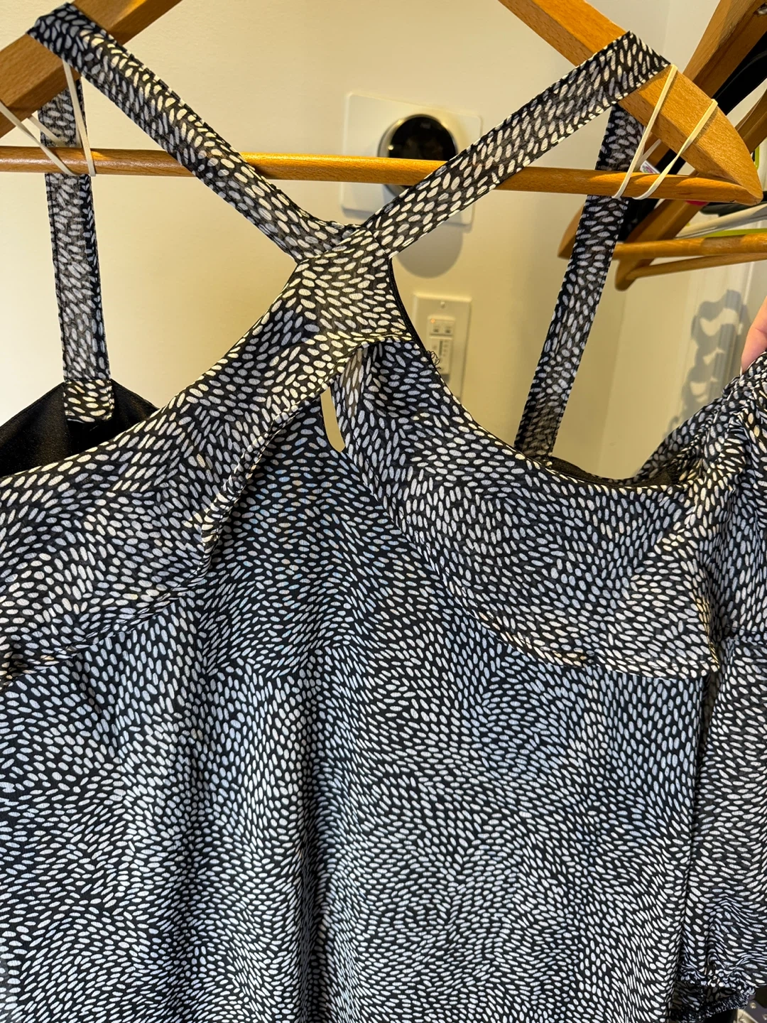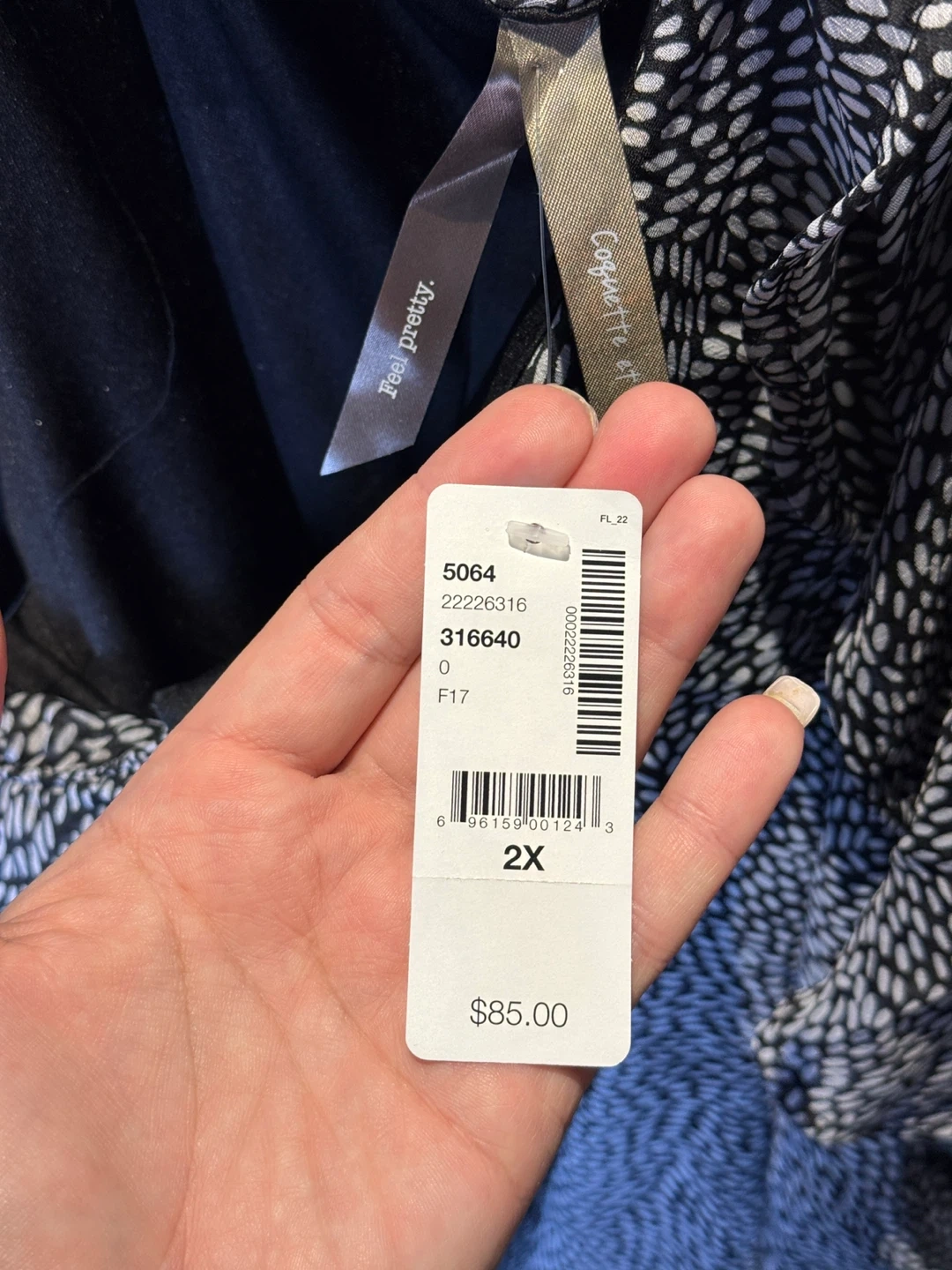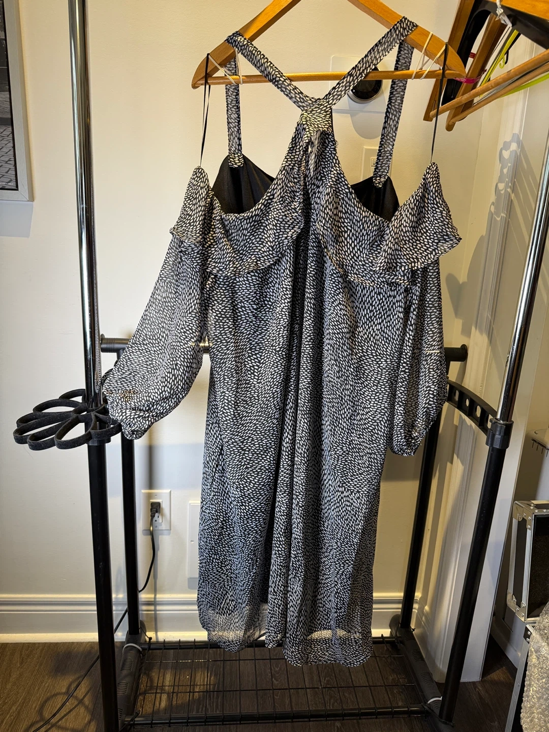 Cute Penningtons dress in a black and white pattern. It's a size 2X and features a unique shoulder design. The original price was $85, new with tags. I think it could even be reversible but not 100% sure. Very versatile from casual to formal.
