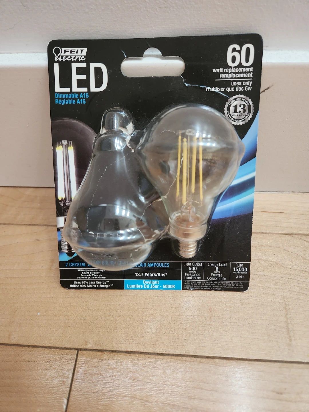 Selling a brand new Feit Electric LED dimmable A15 bulb. It's a 60-watt replacement bulb that only uses 6W. It has a daylight colour of 5000K and a life of 15,000 hours. It comes in the original packaging.