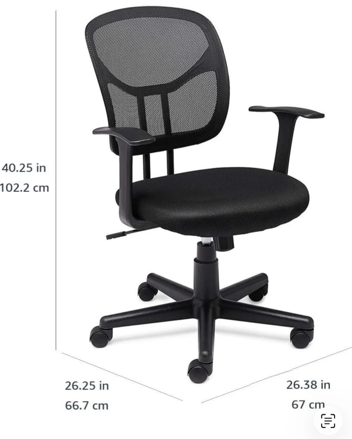 18Looking to sell this comfortable black mesh office chair. It's in great shape and perfect for your home office setup. The dimensions are approximately 40.25 inches (102.2 cm) in height, 26.25 inches (66.7 cm) in width, and 26.38 inches (67 cm) in depth. It's a great addition to any workspace