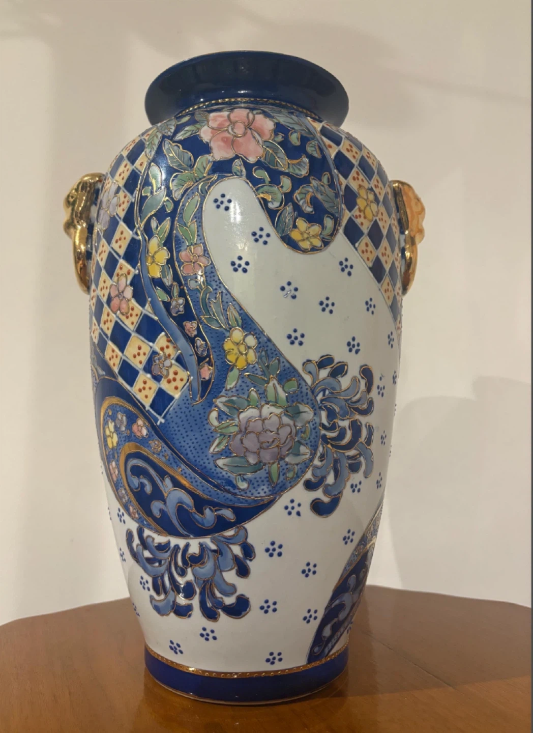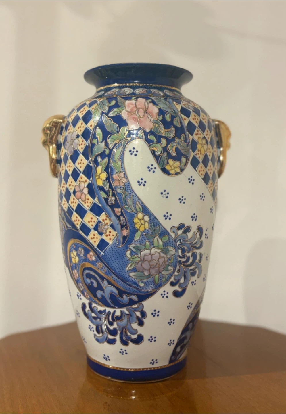 60Beautiful vintage vase with a unique floral design. It features a mix of blue, white, and gold colours, with floral patterns and decorative handles. Perfect for adding a touch of elegance to any room