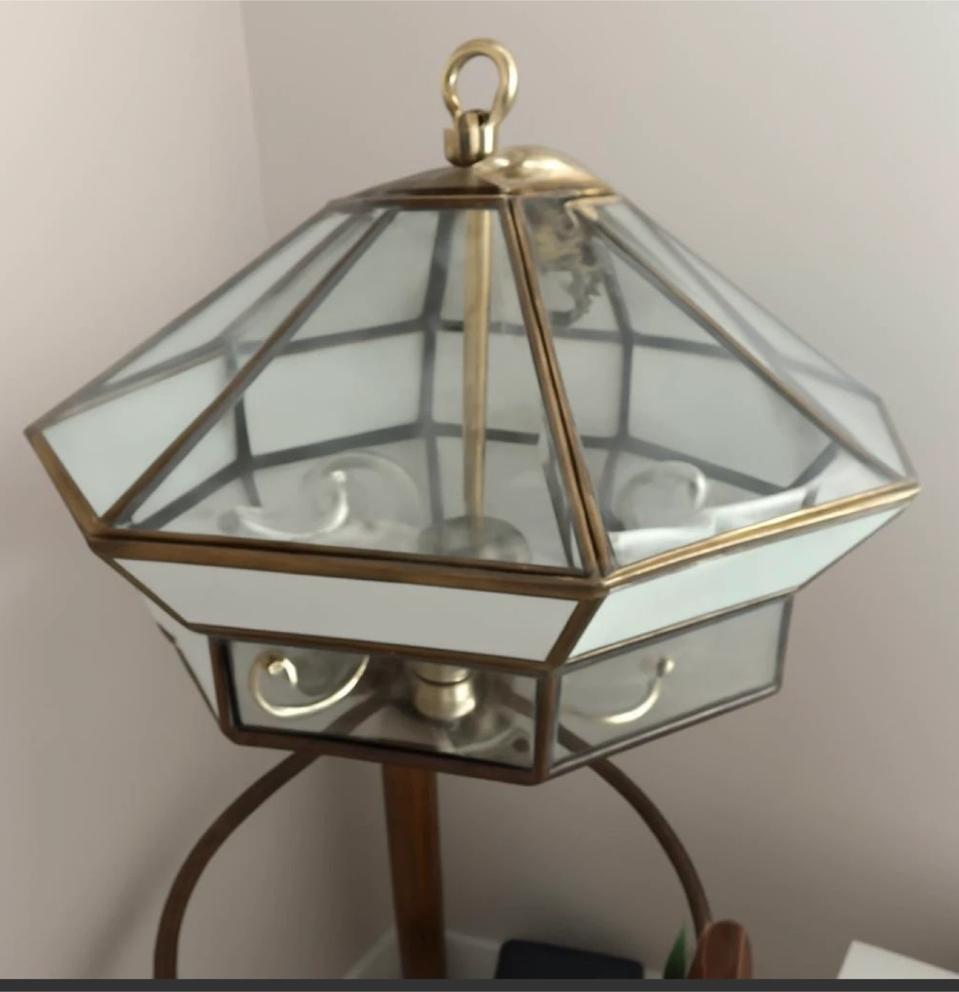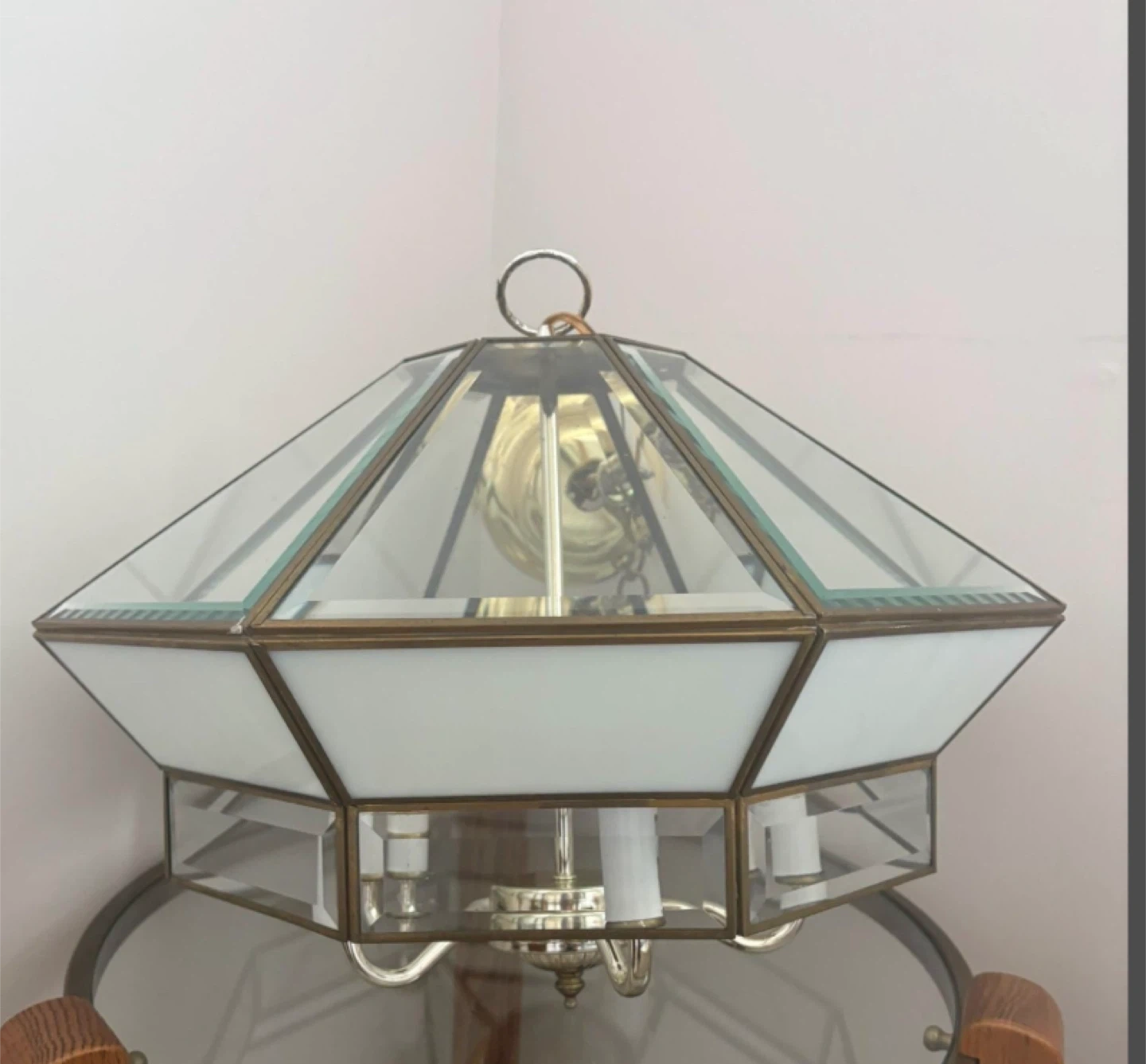 Selling a vintage-style octagon glass pendant light! It features a brass-tone frame and frosted white glass panels. It would make a lovely addition to any room!