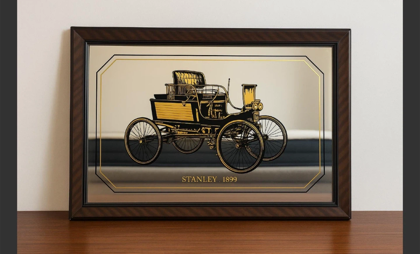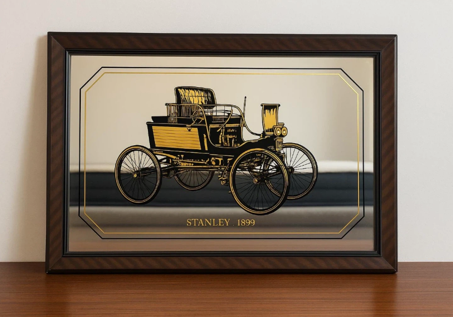 60Selling a decorative mirror featuring a Stanley 1899 car design. It has a wooden frame and would look great in a garage, office, or living room