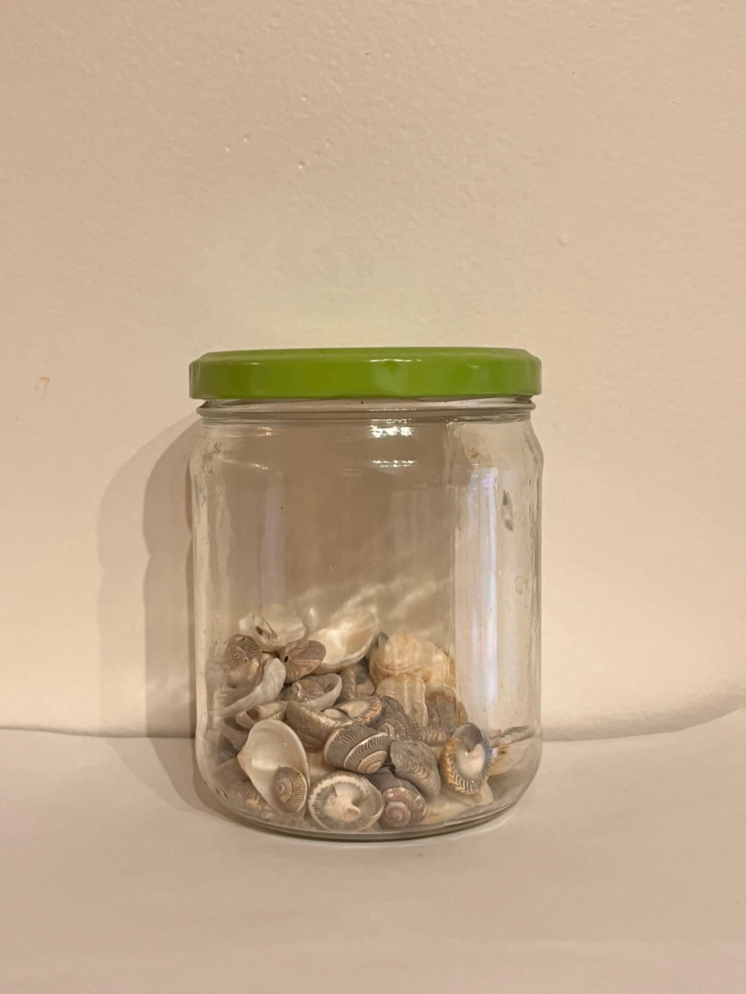 A variety of small seashells both white and blue. The white ones were gifted to me though I don’t recall from where or why. The blue grey ones were purchased in a generic store. I honestly felt bad to see them there and think they deserve a better life than just sitting on a shelf since they can’t go back to an ocean now. Maybe you have a kiddo who is marine obsessed and likes arts and crafts with shells?