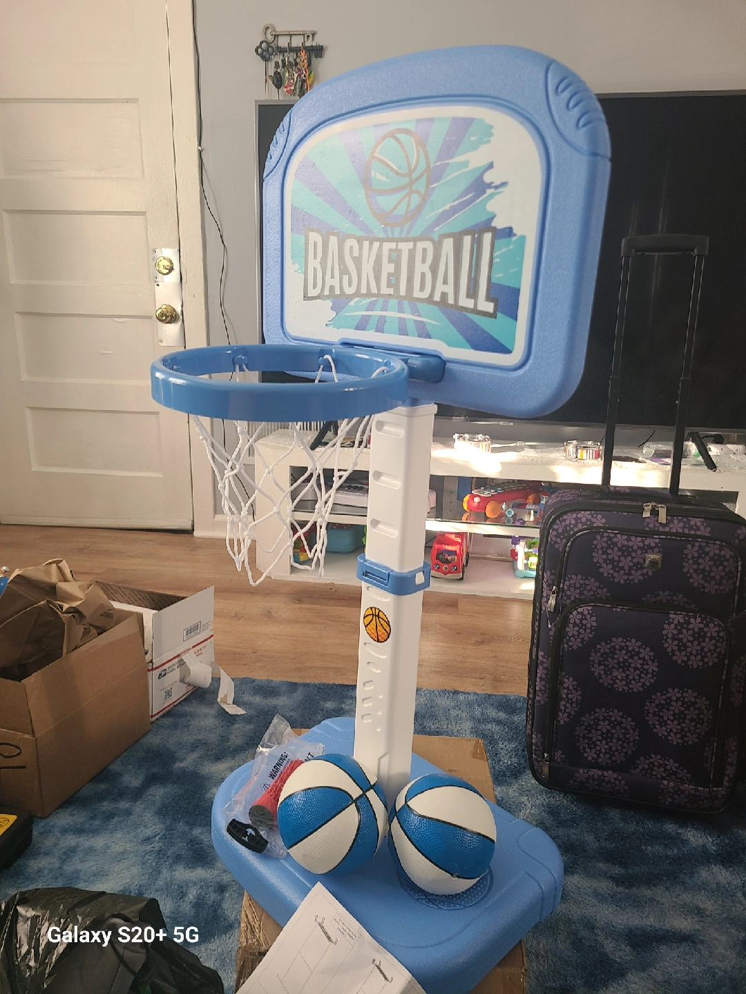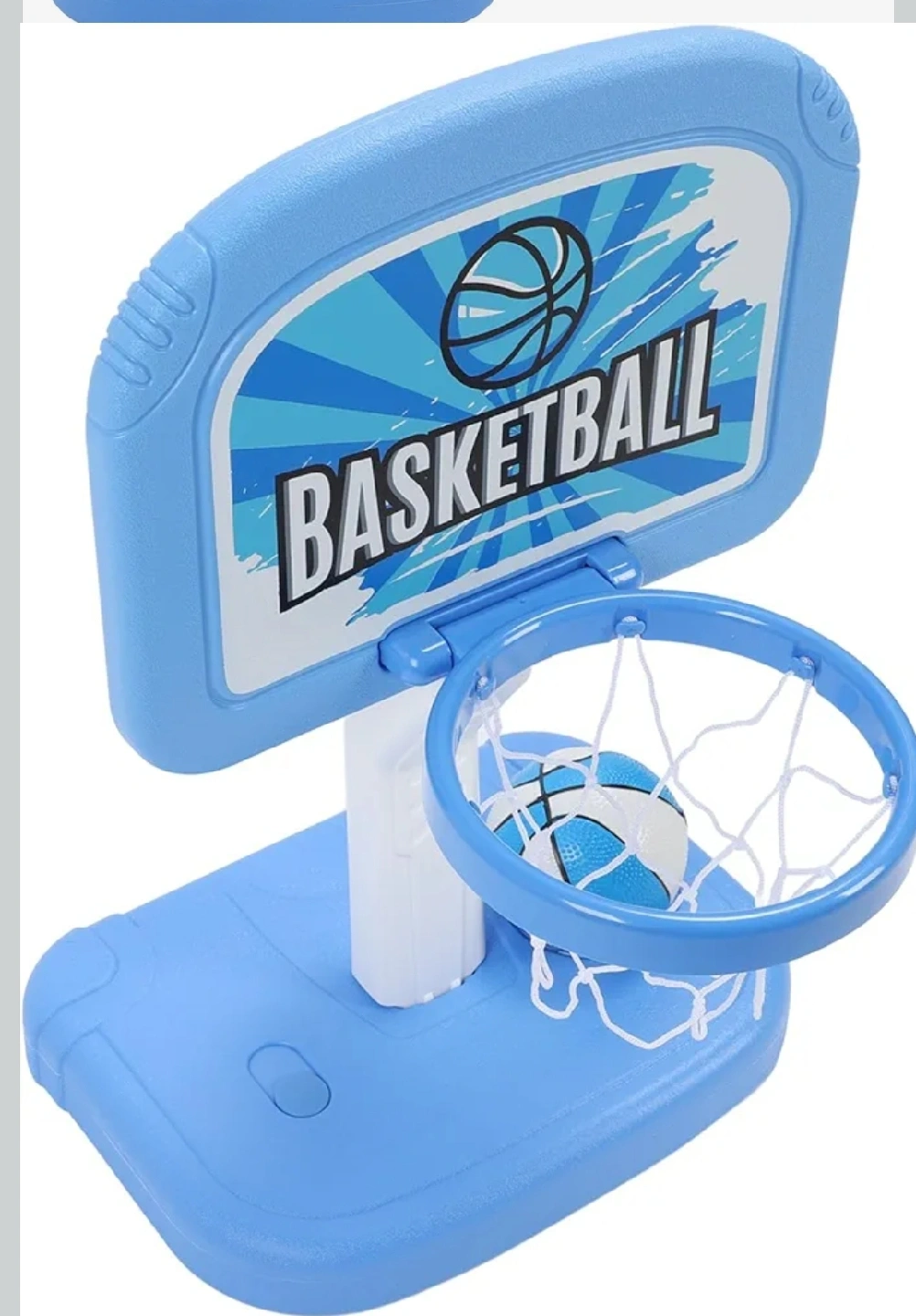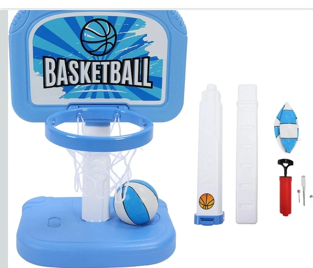 this is a fun basketball hoop set for kids! It comes in blue and includes the hoop, net, stand, two basketballs, and a pump to inflate the balls. Great for indoor or outdoor play