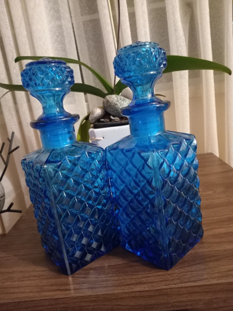 Selling a set of two beautiful blue glass decanters! They have a lovely geometric pattern and would look great on any shelf or bar cart. Perfect for adding a pop of colour to your home decor