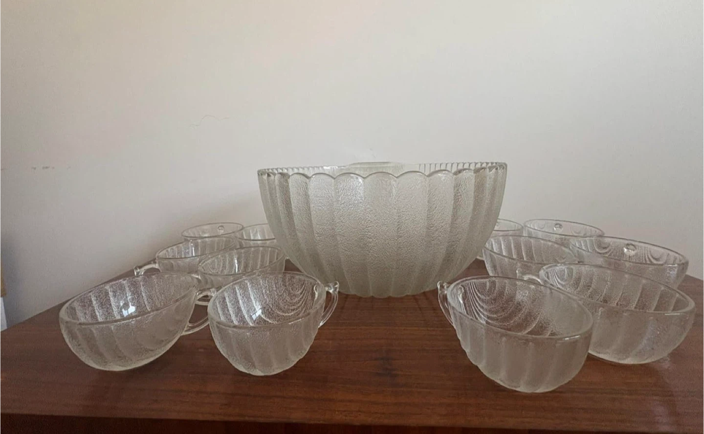 Selling a vintage punch bowl set that includes a large punch bowl and 12 matching cups. The set features a textured glass design, adding a touch of elegance to any gathering. Perfect for parties or special occasions!