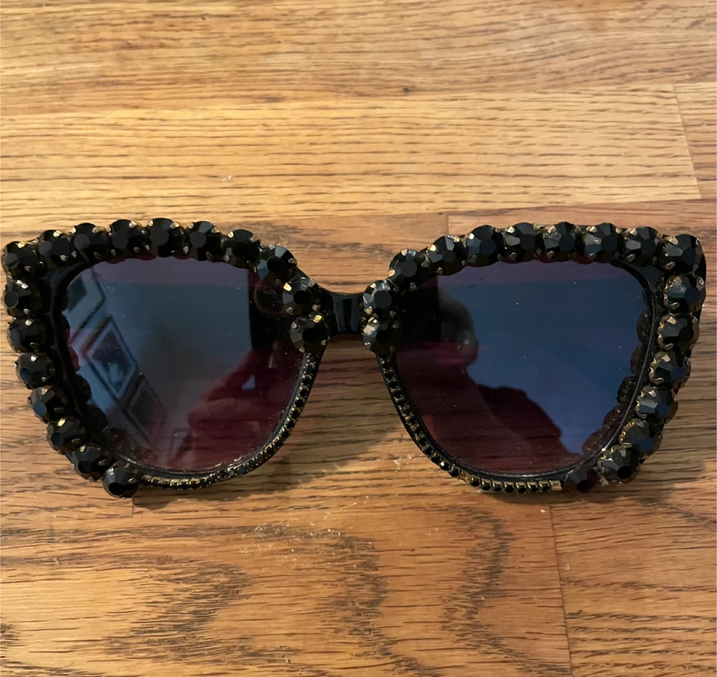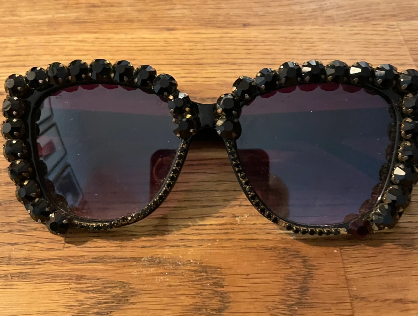 Selling a pair of black sunglasses with beaded detailing around the frames. They're in good condition and ready for a new owner! Black Swarovski jet crystals. Dark oversized frames and lenses. Chic