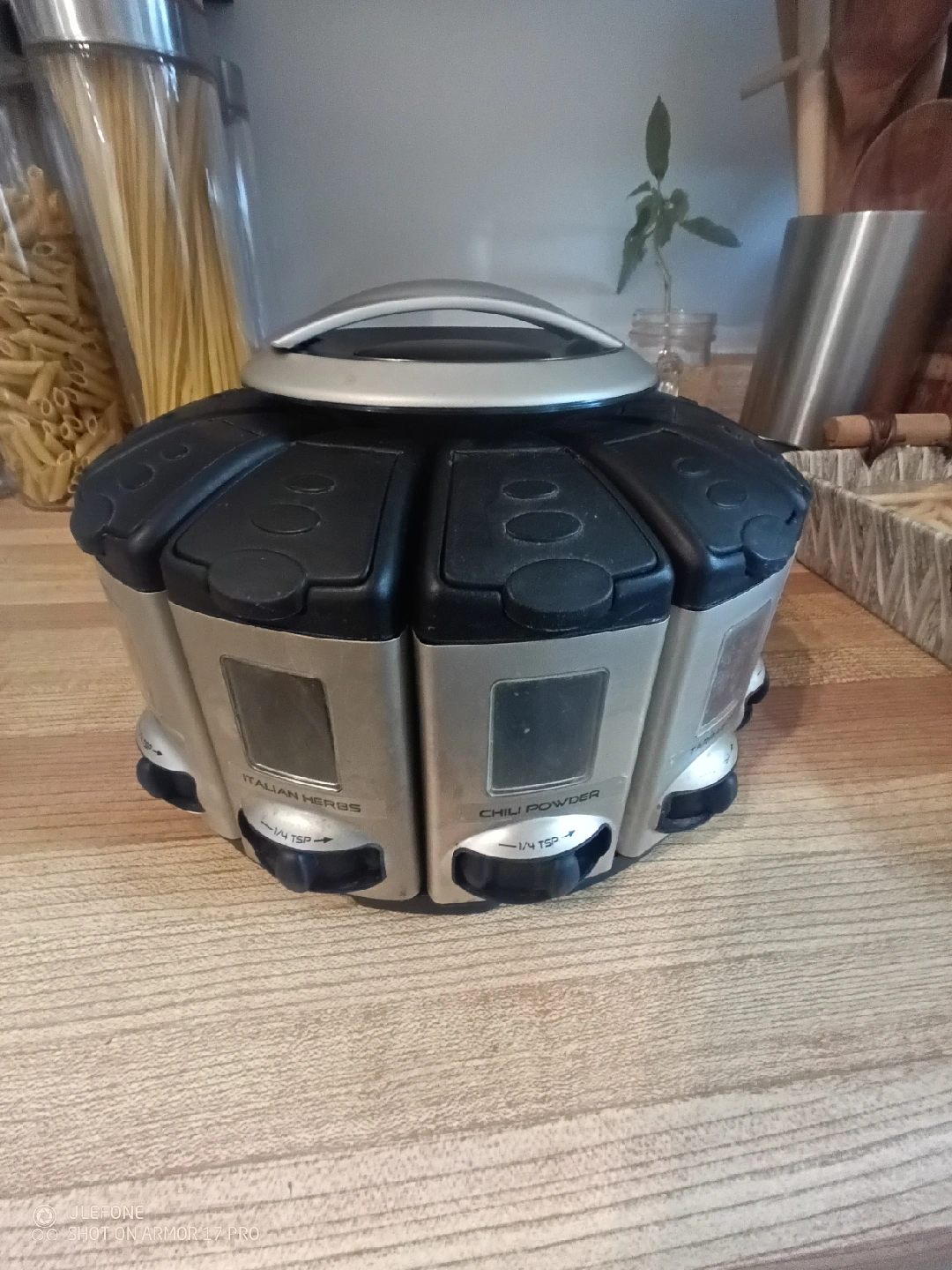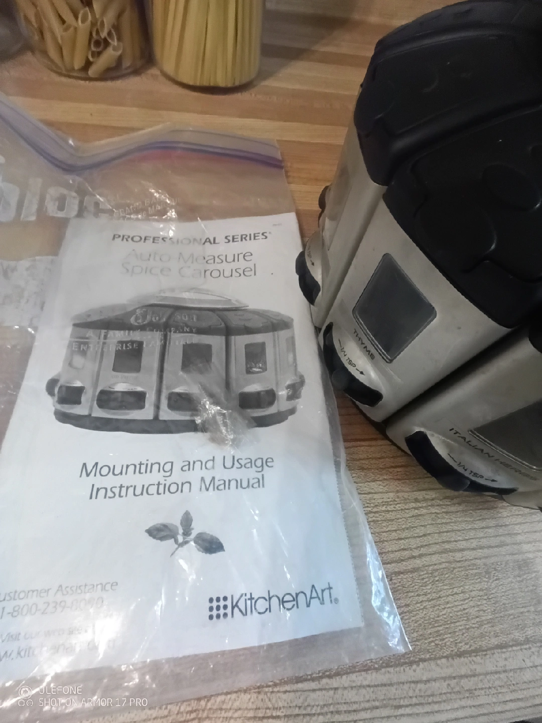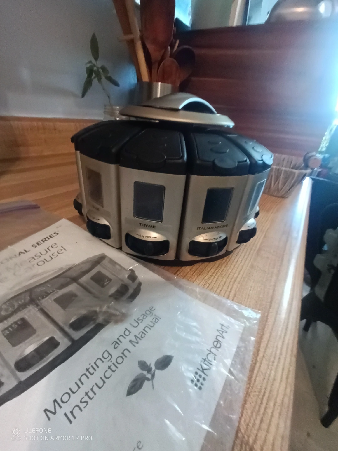 Selling a KitchenArt Auto-Measure Spice Carousel! It's a great way to keep your spices organized and easily accessible. Comes with the mounting and usage instruction manual. Can add another level to stack or mount under cabinet. Has a measurement compartment. Brushed nickel finish.