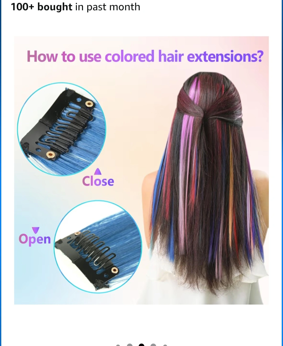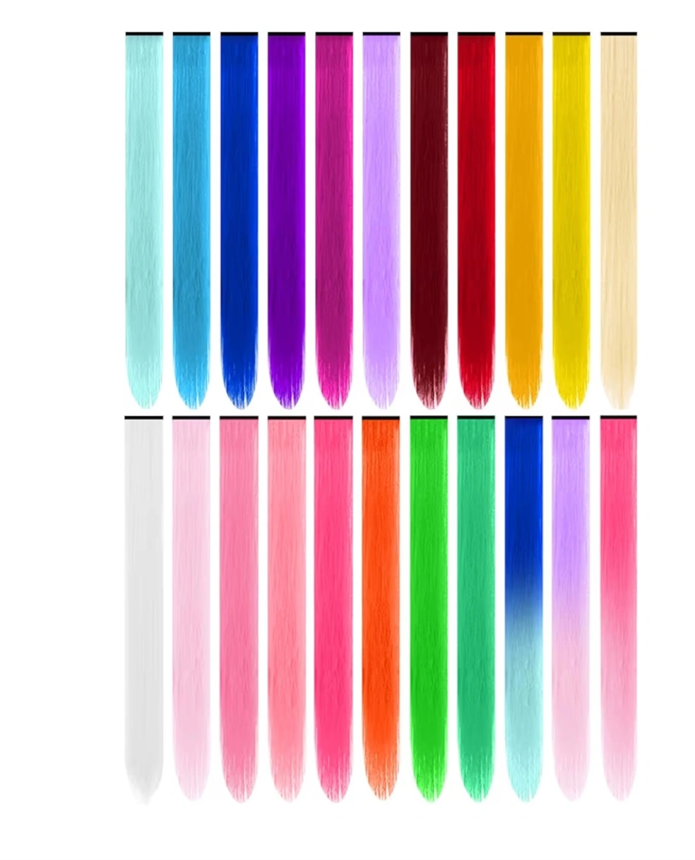 Add a pop of colour to your hair with these fun clip-in extensions! This set includes 22 pieces in a variety of vibrant colours. They're easy to use, can be curled and trimmed to match your style. Each extension is 22 inches (55cm) long and features a secure steel clip for strong grip. Made of natural hair, they're soft and silky to the touch