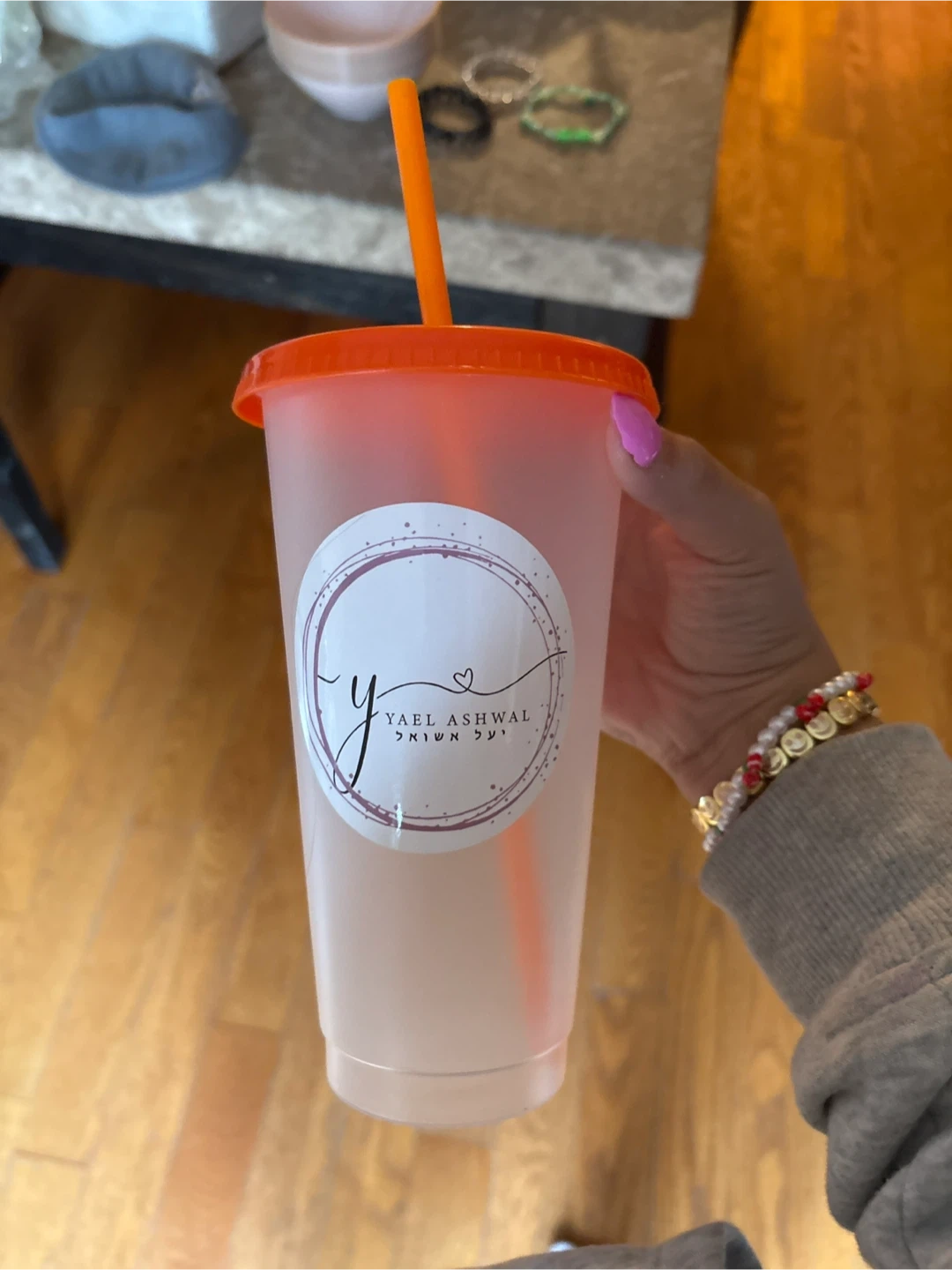 A cute colour changing cup with the name "Yael Ashwal" on it! It comes with a straw and is perfect for everyday use. Great for keeping your drinks cold and showing off your unique style