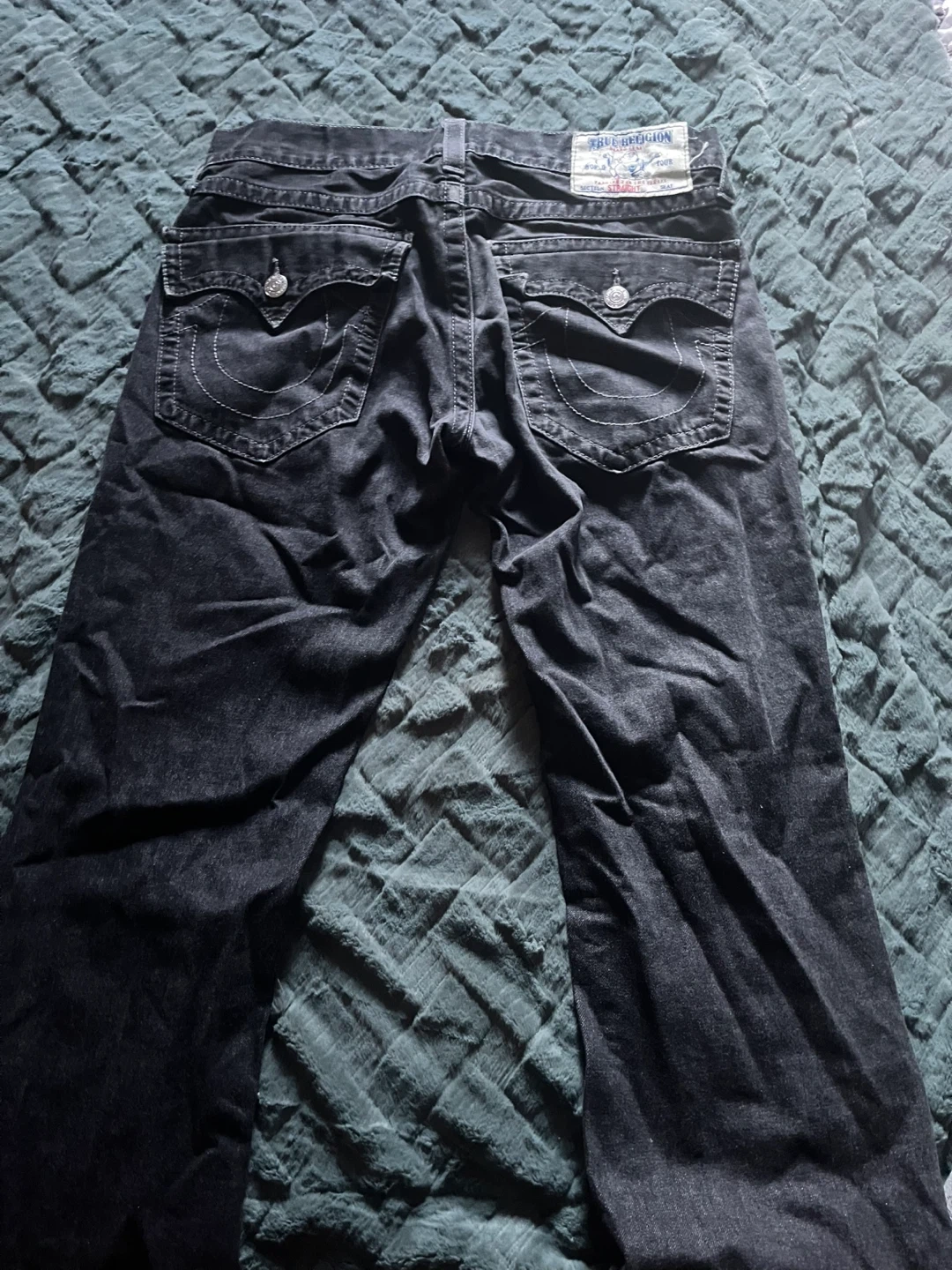 10Selling a pair of True Religion jeans in black. They're in good condition and have the signature True Religion detailing on the pockets. Perfect for a casual look!