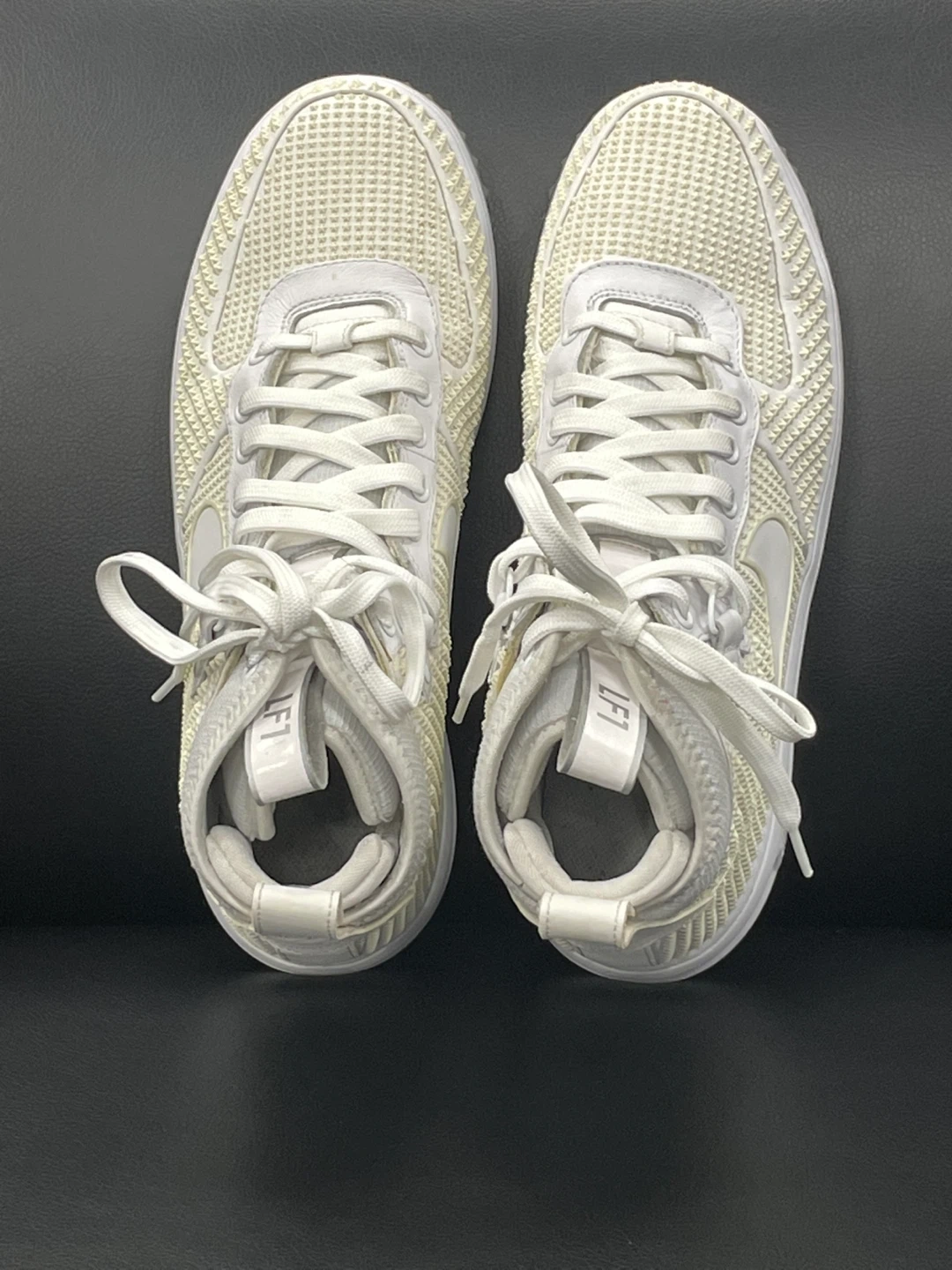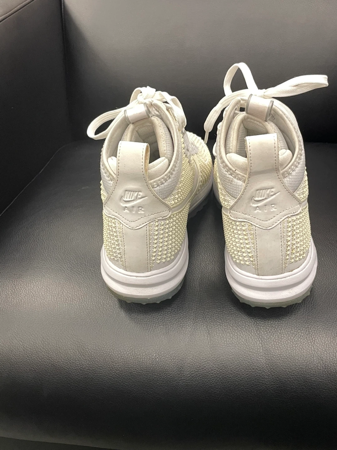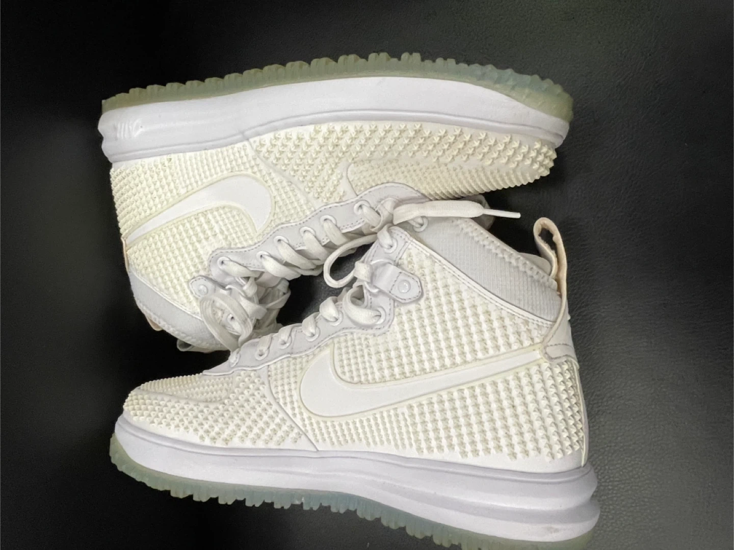 Step up your sneaker game with these white 2015 Nike Lunar Force 1 Lifted shoes size 10.5! These stylish and comfortable high-tops feature a unique all-white design with a Lunar sole for extra cushioning, perfect for everyday wear. These shoes are in used, but good condition, ready to turn heads wherever you go.