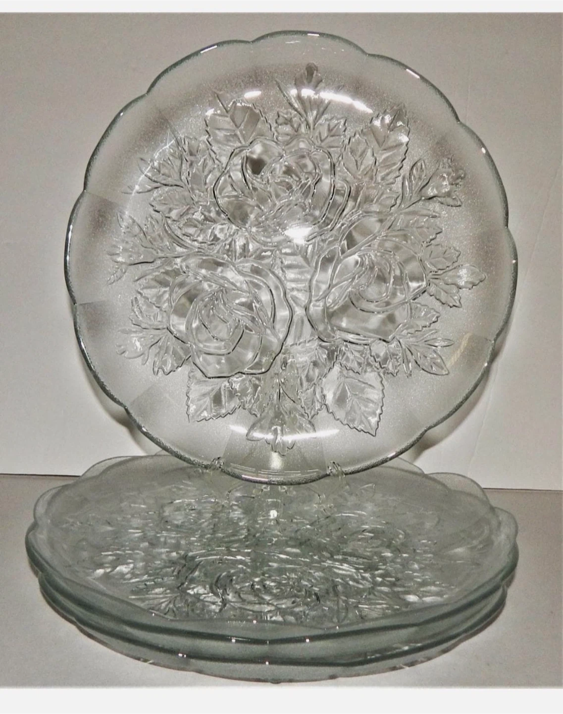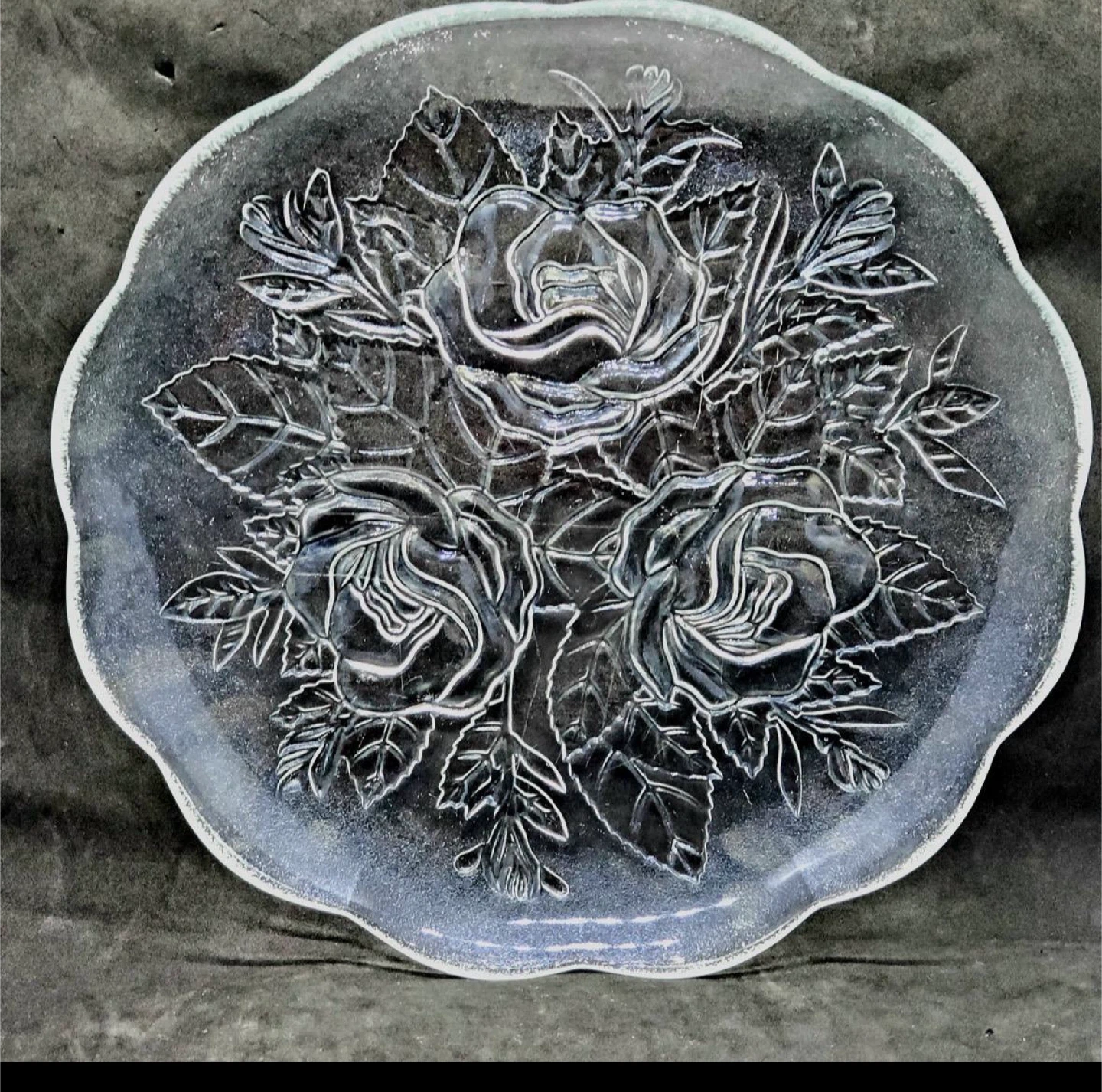 Selling a beautiful vintage clear glass plate with a rose design. It would be a lovely addition to any table setting or collection. The plate is in great condition and ready for a new home!