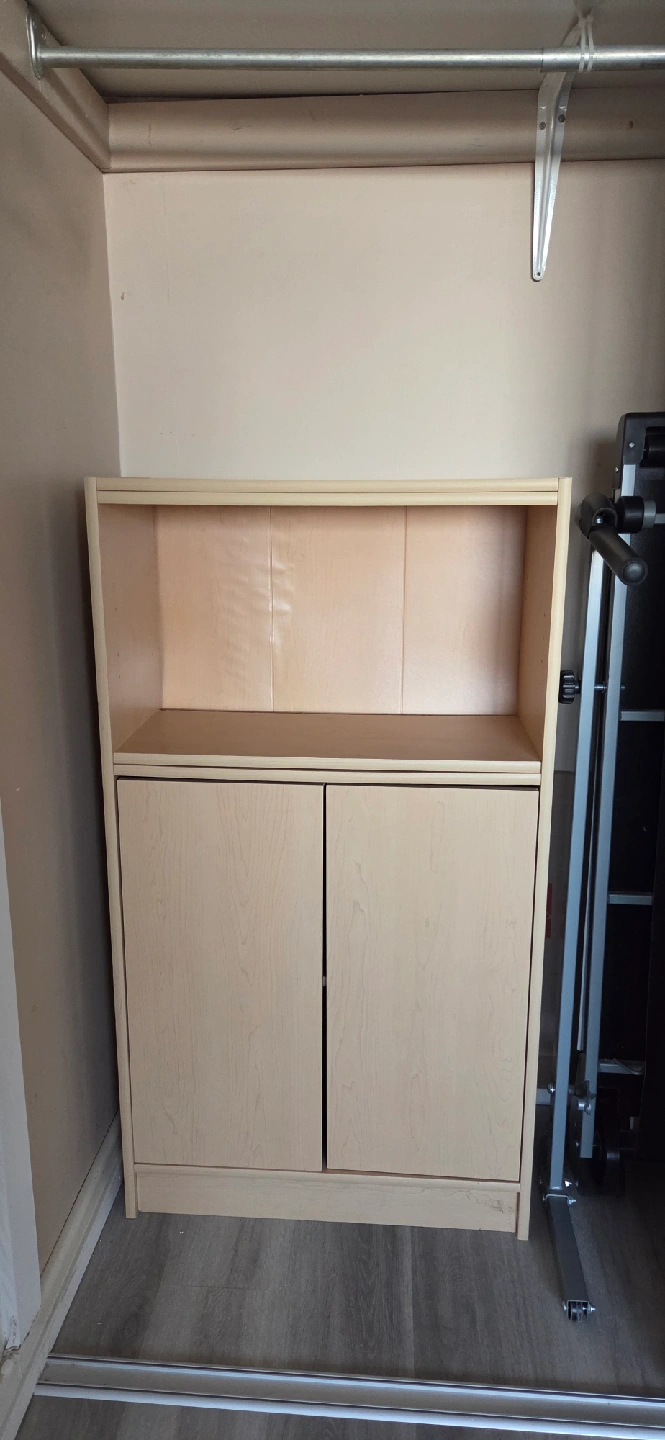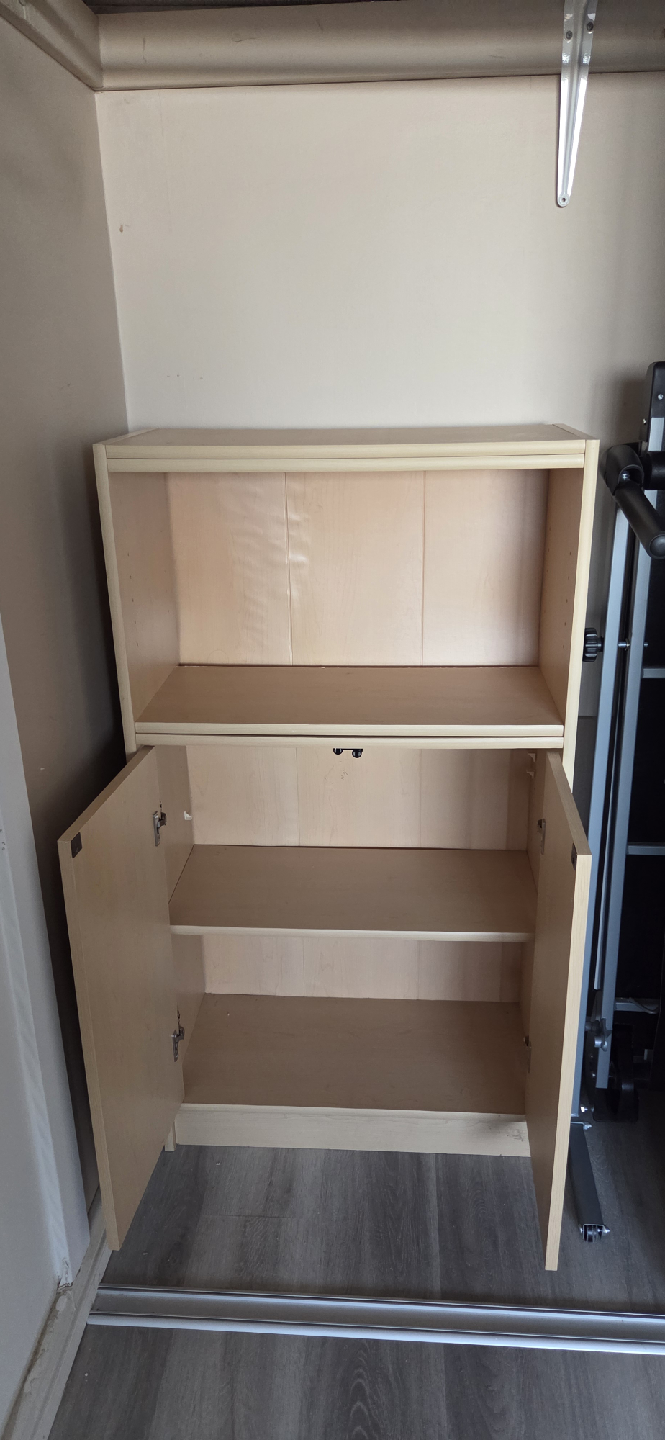 Here's a wooden cabinet with shelves, and doors perfect for extra storage and to keep things hidden as well! It's in good condition and ready for a new home. It has two doors for the bottom section and open shelving above.