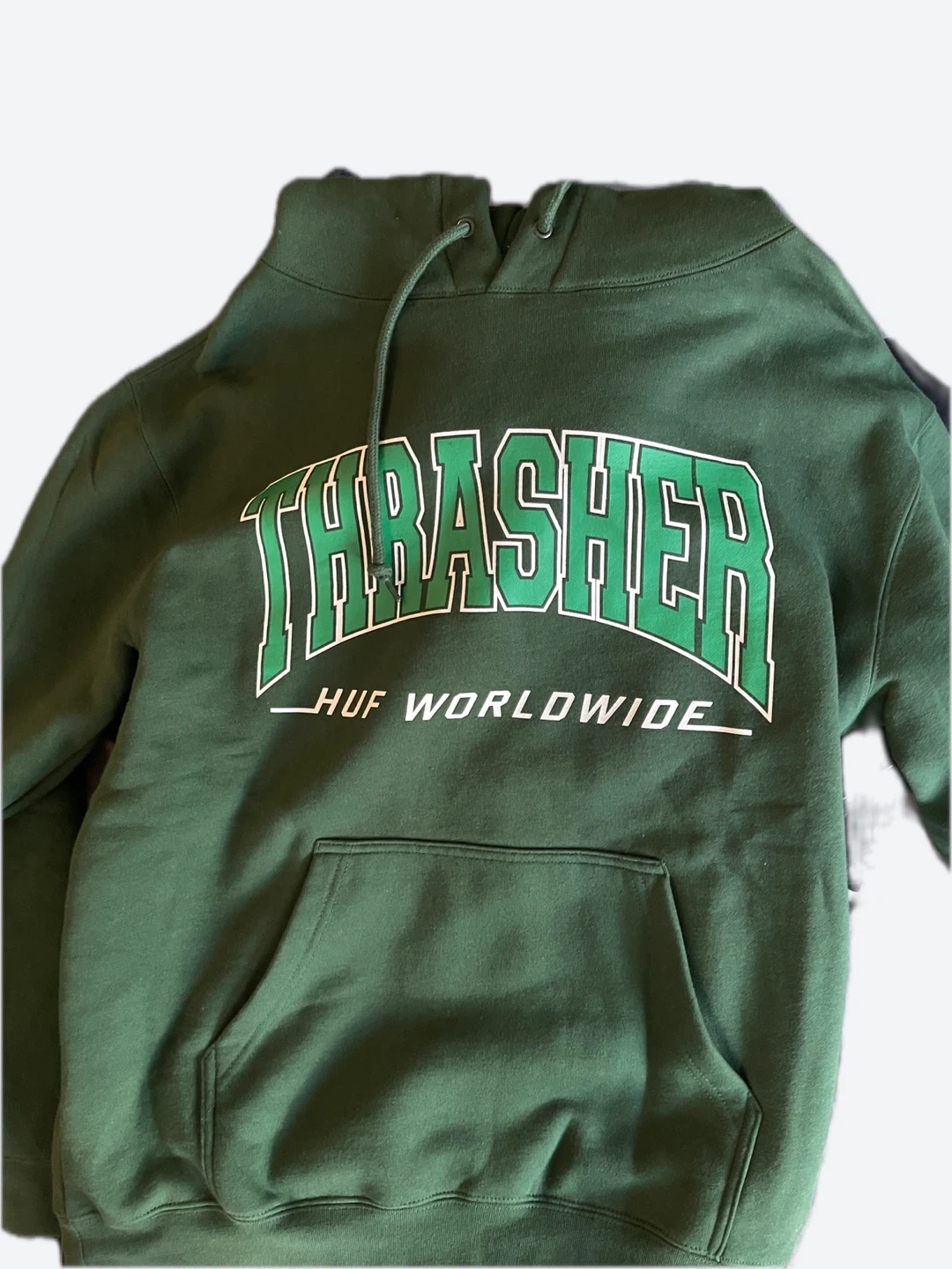 10Selling a HUF x Thrasher Bayview P/O Hoodie in forest green. It's a size small. Style Name: Bayview P/O Hoodie Color: Forest Green Size: S Style#: PF00563