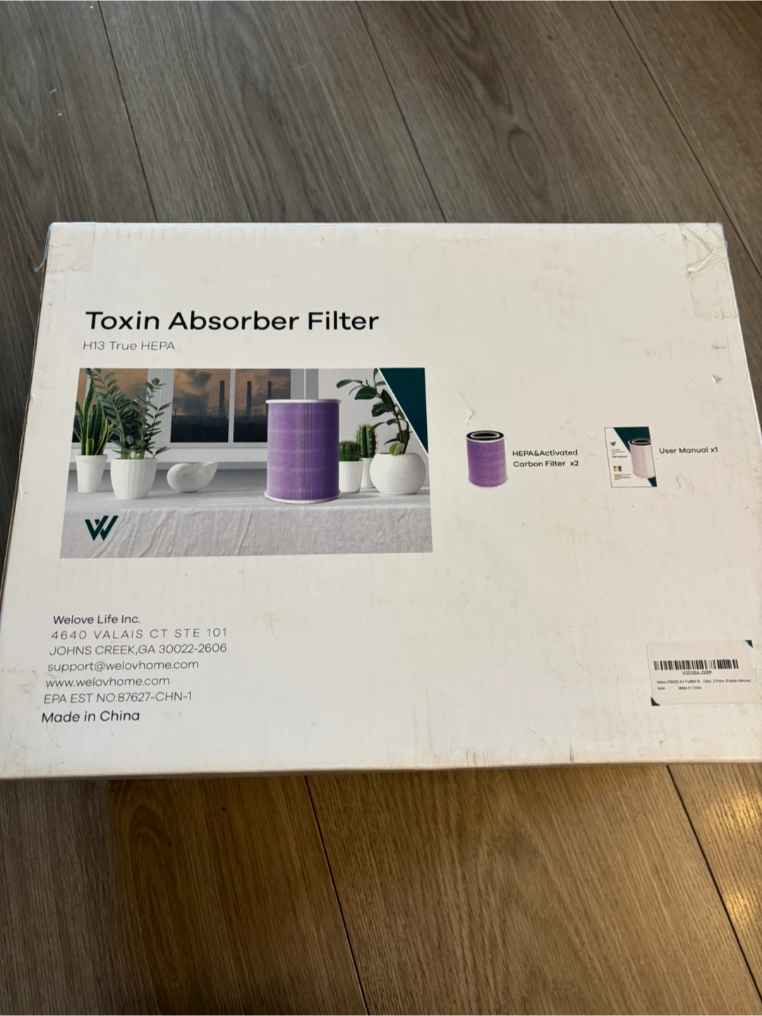 Selling a brand new Welov Toxin Absorber Filter! This is an H13 True HEPA filter designed to remove small particles, dust, smoke, pollen, and viruses. It also features an activated carbon filter to deal with odours, smoke, VOCs, and formaldehyde. It's a 3-stage filtration system that includes a pre-filter for larger particles like dust and pet hair. Includes two HEPA and activated carbon filters, plus the user manual