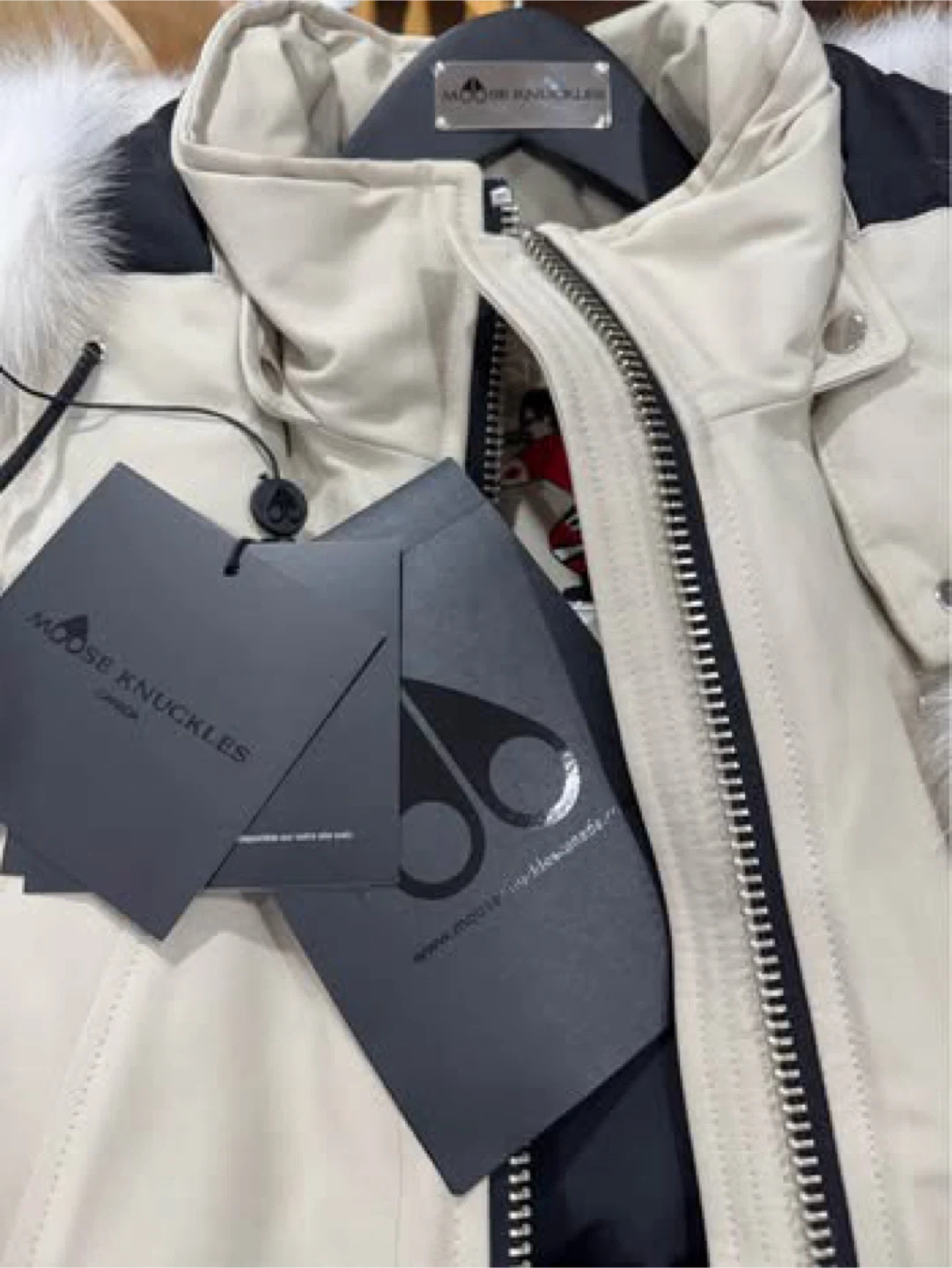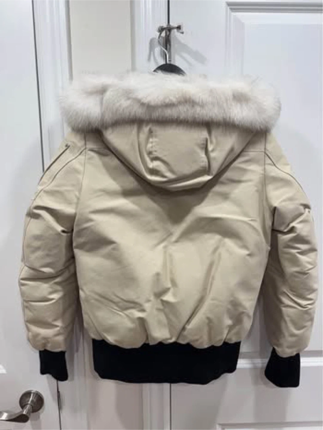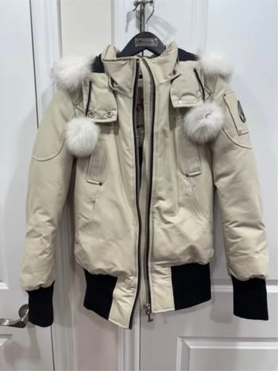 Cozy up in this stylish Moose Knuckles down bomber jacket! It's a beautiful cream colour with a fur-trimmed hood, perfect for staying warm during those chilly Canadian days. The jacket comes with its original garment bag for storage and protection. It's in great condition and ready for a new home! Selling my Moose Knuckles in very good condition. Small size. In Bone/Natural color. Just worn twice. Still have the tags, original hanger and bag. SELLING LOW. Originally $1,190 + tax in retails. I don't have the receipt though, but you can authenticate this coat via NFC scan through your phone. The NFC tag is inside the coat. RFS: had two babies! Does not fit anymore. You can check it yourself in person before buying. Serious buyer only. CASH ONLY