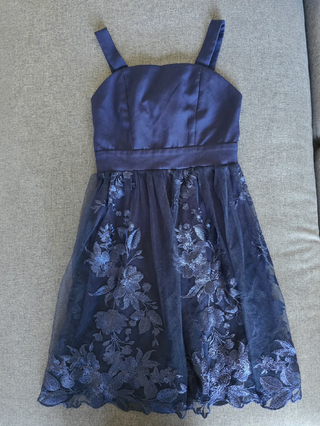 It's a lovely navy blue colour with floral embroidery on the skirt. There's a cute bow detail on the back.