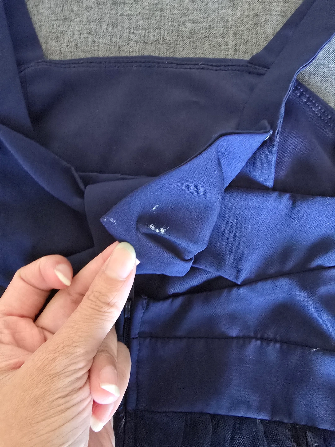 There are some minor white spots on the back of the dress as pictured, but not visible when worn.