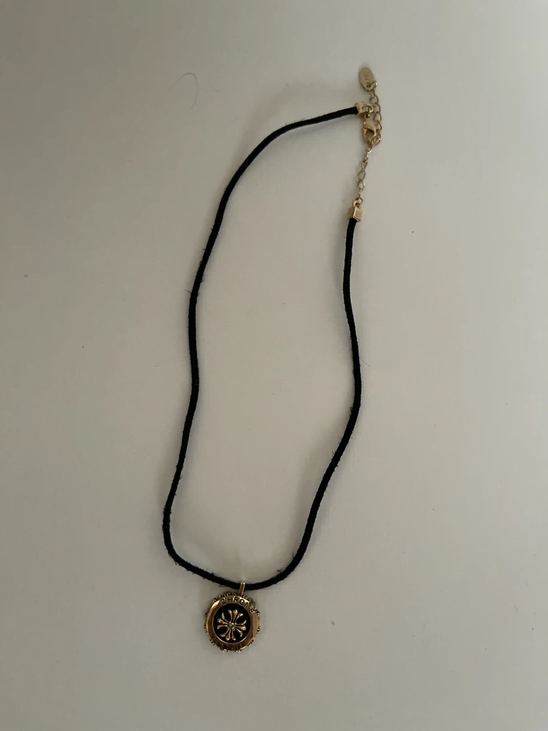 Selling a Hearts necklace featuring a gold-plated pendant with a black cord. The pendant has the classic Chrome Hearts cross design with 'Chrome' and 'New York' engraved around the edge. It's in great condition and perfect for adding a touch of style to any outfit