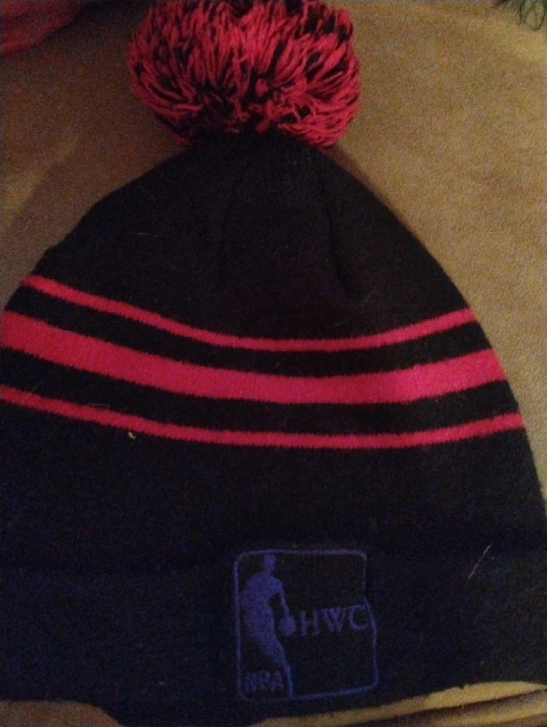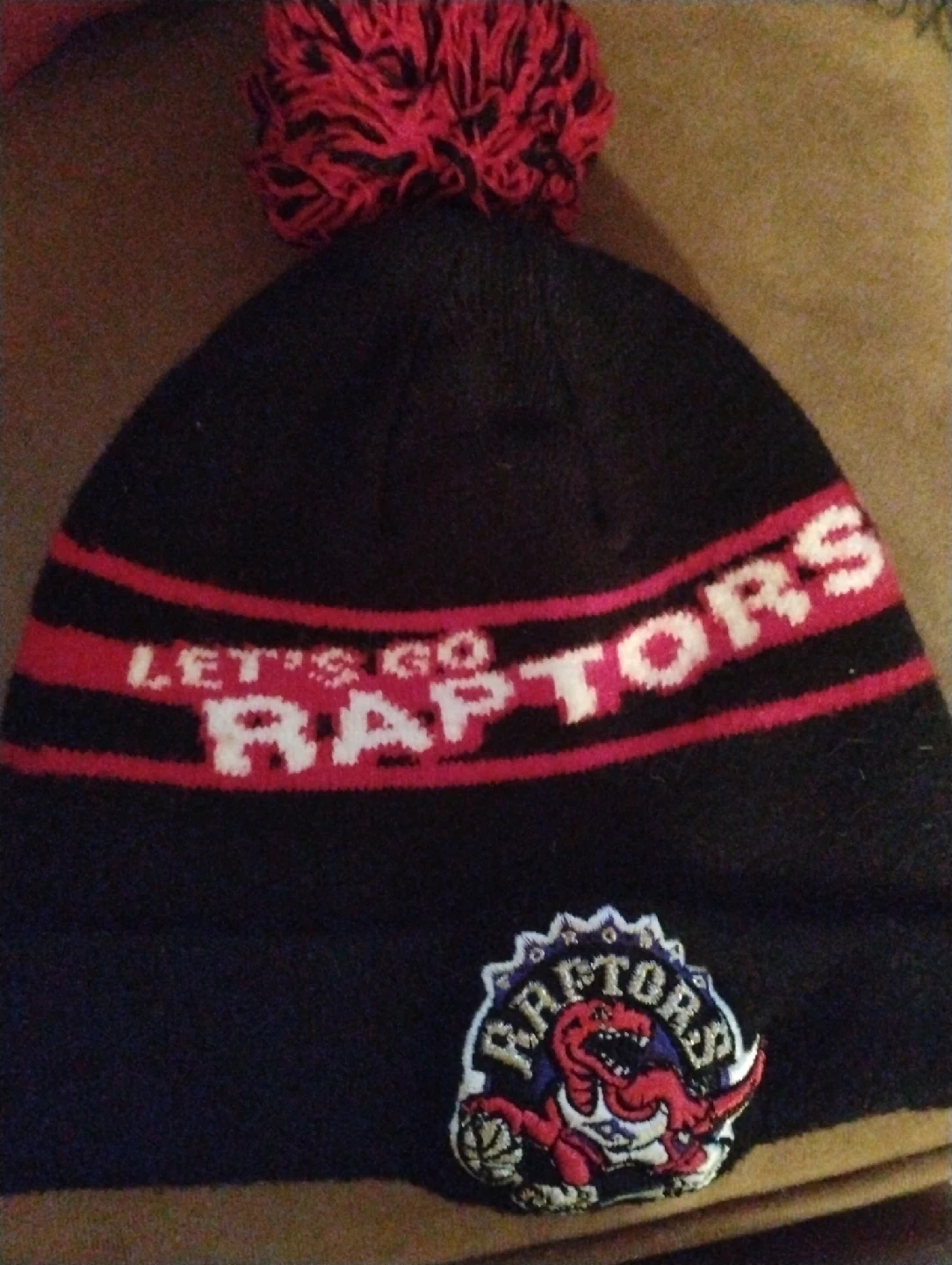 531Selling a Toronto Raptors beanie with a pom pom on top! It's black with red stripes and has the Raptors logo on the front. Great for showing your team spirit during the colder months