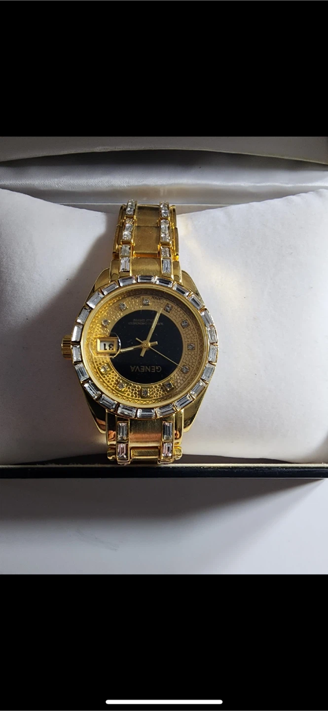 Selling a beautiful gold-tone Geneva watch! It features a black face and sparkling rhinestones around the bezel and on the band. It comes in its original box and is in great condition. Perfect for adding a touch of elegance to any outfit