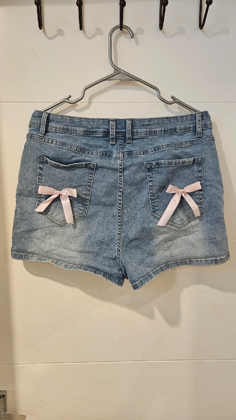 Cute denim shorts with light pink bows on the back pockets. These shorts are in great condition and ready for a new home. Perfect for casual wear or dressing up!