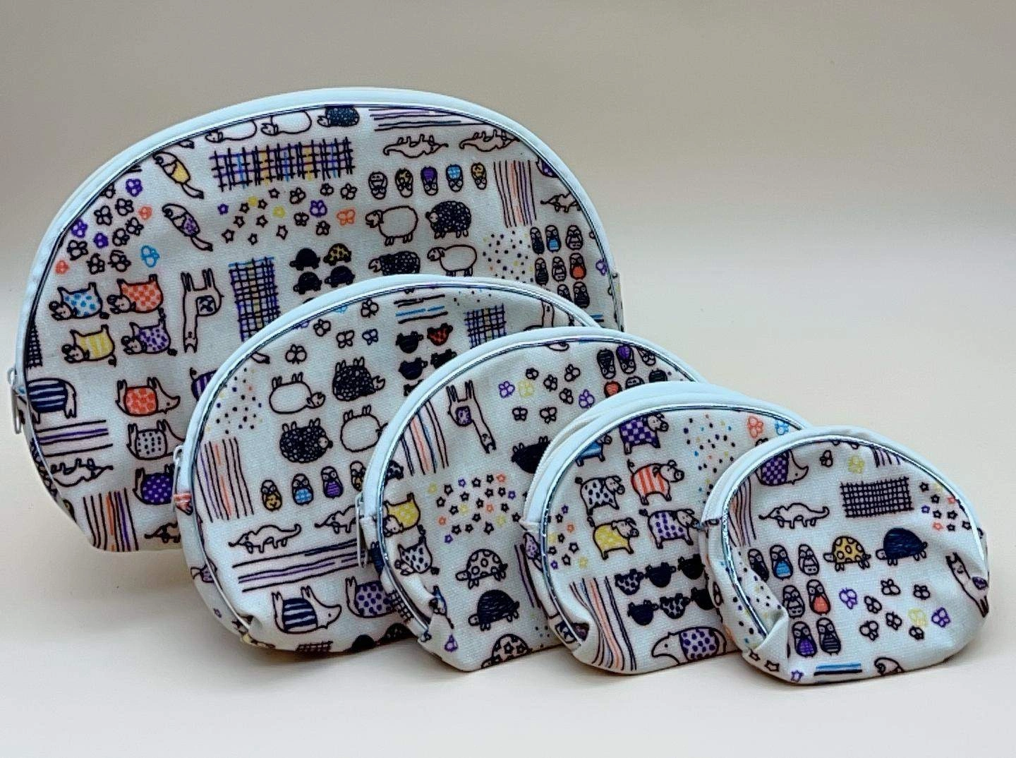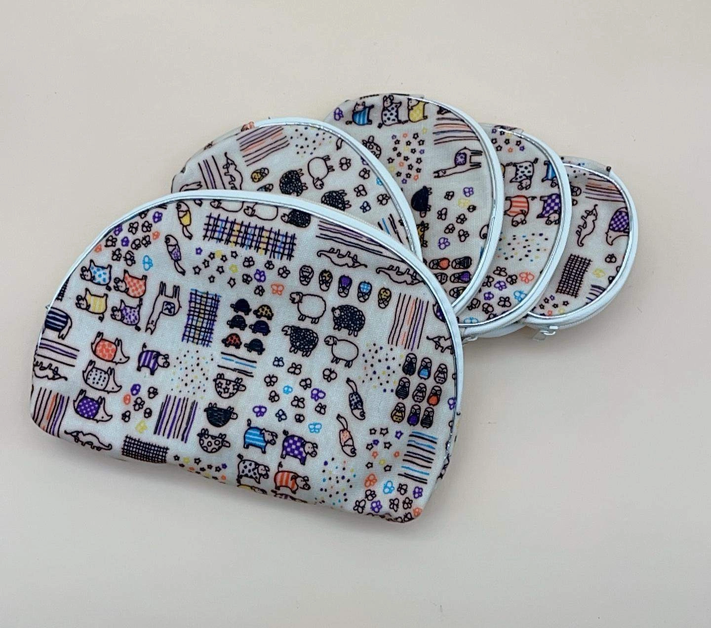 54Set of 5 whimsical half-moon pouches in white fabric printed with colorful farm animals, patterns, and stripes—cute, playful storage for small essentials like cosmetics or trinkets! Bottom: Elegant black velvet long-sleeve dress with gray striped panels, boat neck, and midi length—luxurious texture for chic evenings out. 💄👗