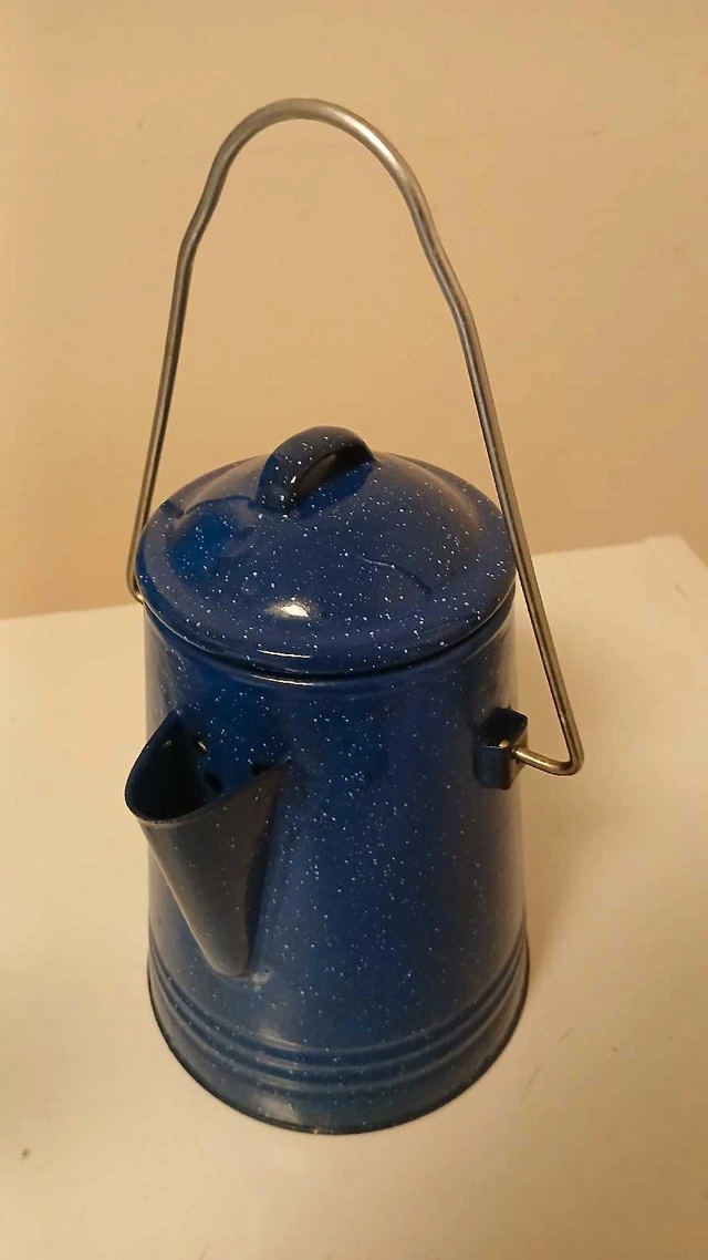 Brew a delightful cup of joe with this charming blue and white speckled enamelware coffee percolator, perfect for camping or adding a vintage touch to your kitchen. It's in great condition and ready to use. Additional features include: * Durable enamelware construction * Classic speckled design * Includes all original components * Easy to clean