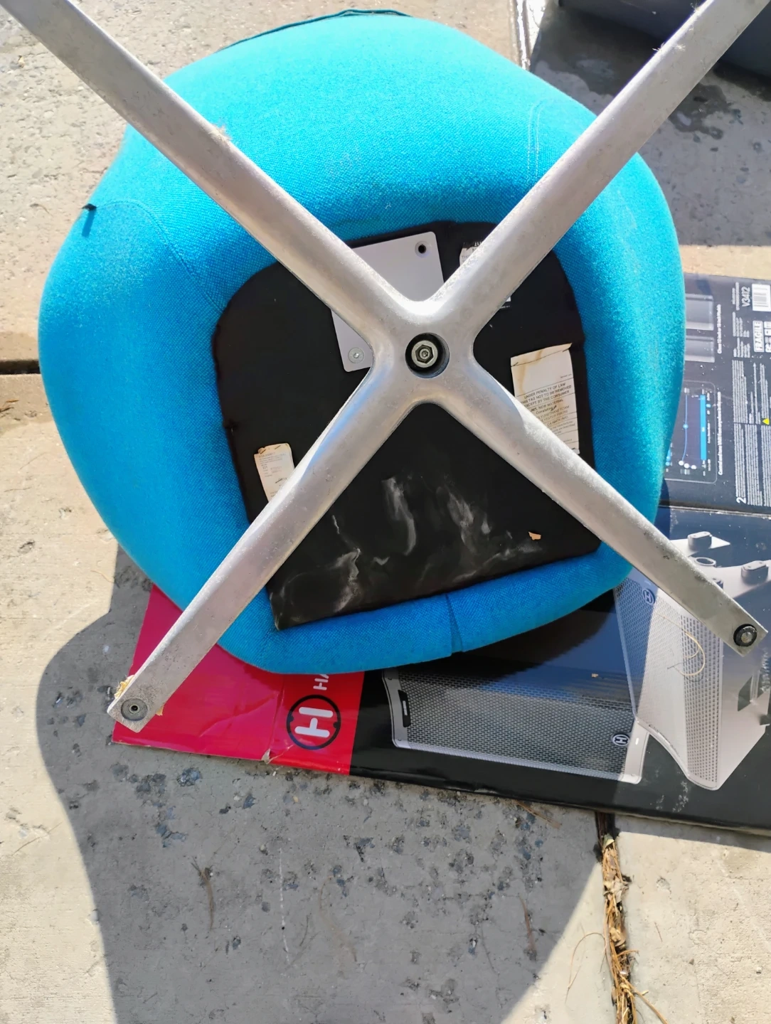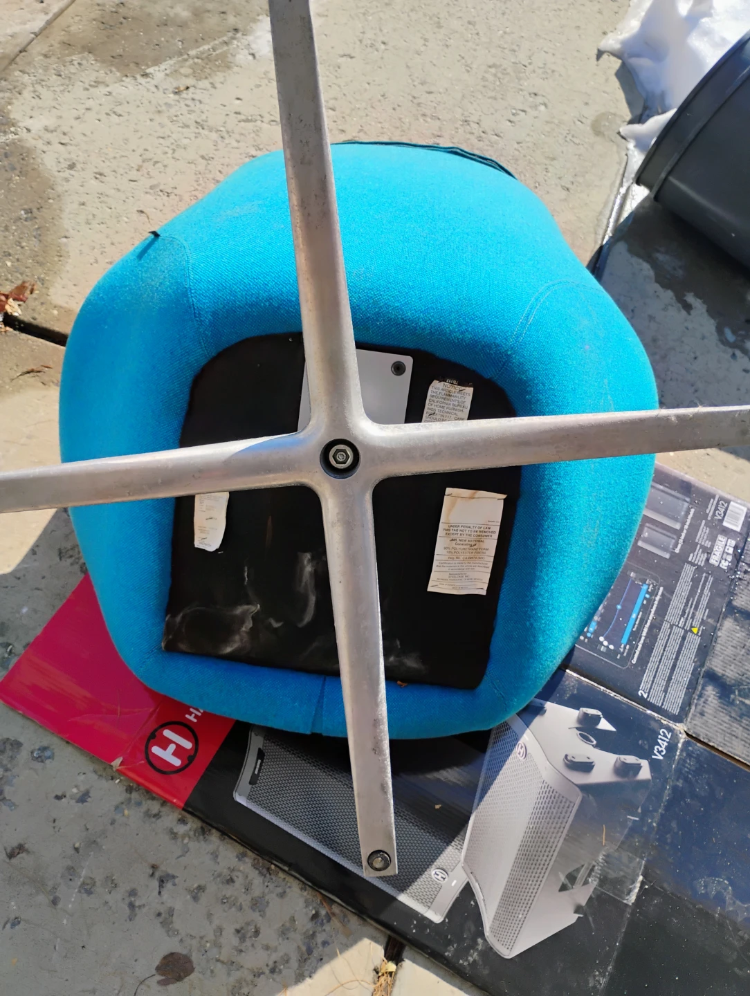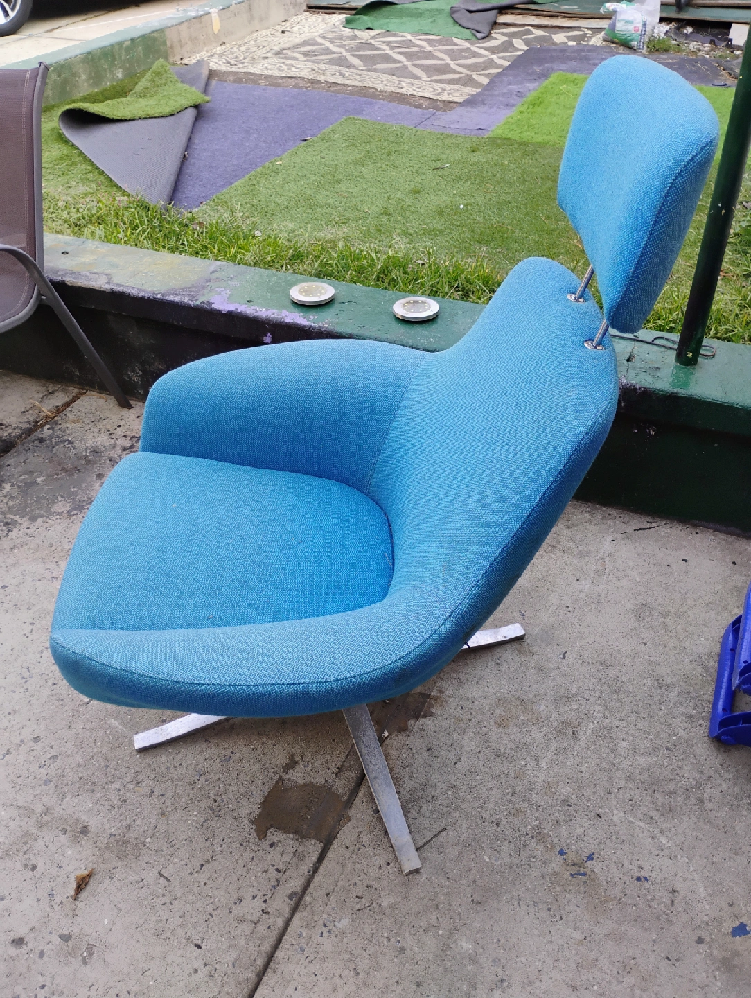 Selling a vintage blue swivel chair! It's in good condition and would be a great addition to any room. The chair features a unique design with a headrest and a sturdy swivel base. It's perfect for relaxing or reading a book. The color is a vibrant blue, and the material is a comfortable fabric. Don't miss out on this stylish piece!