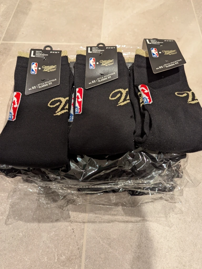 Selling 21 pairs of new Miller Genuine Draft NBA socks. They are size large and in original packaging. Great for any NBA fan! SFH.