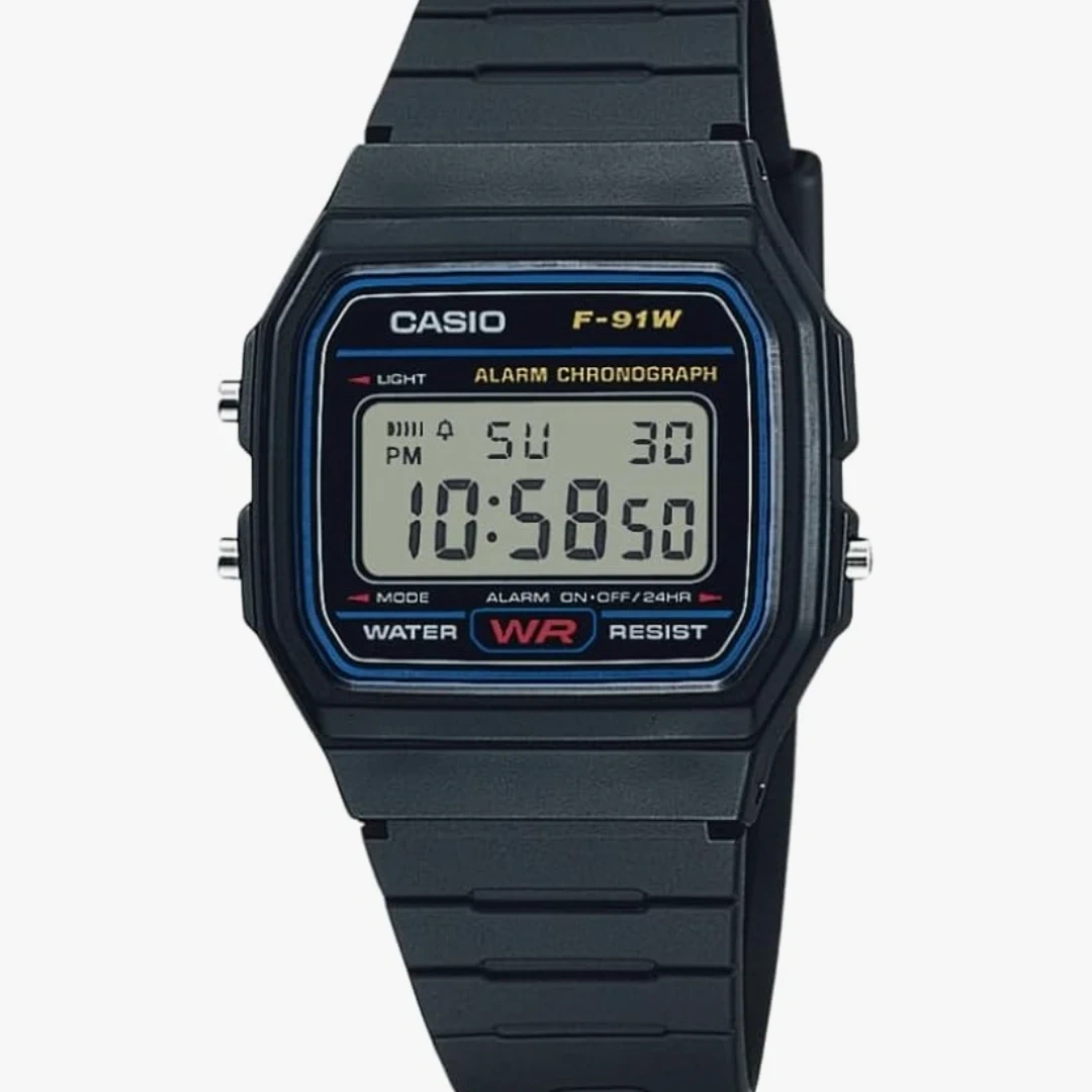 54Selling a classic Casio F-91W watch in black! This watch is known for its simple design and durability. It features an alarm, chronograph, and is water-resistant. Perfect for everyday wear!