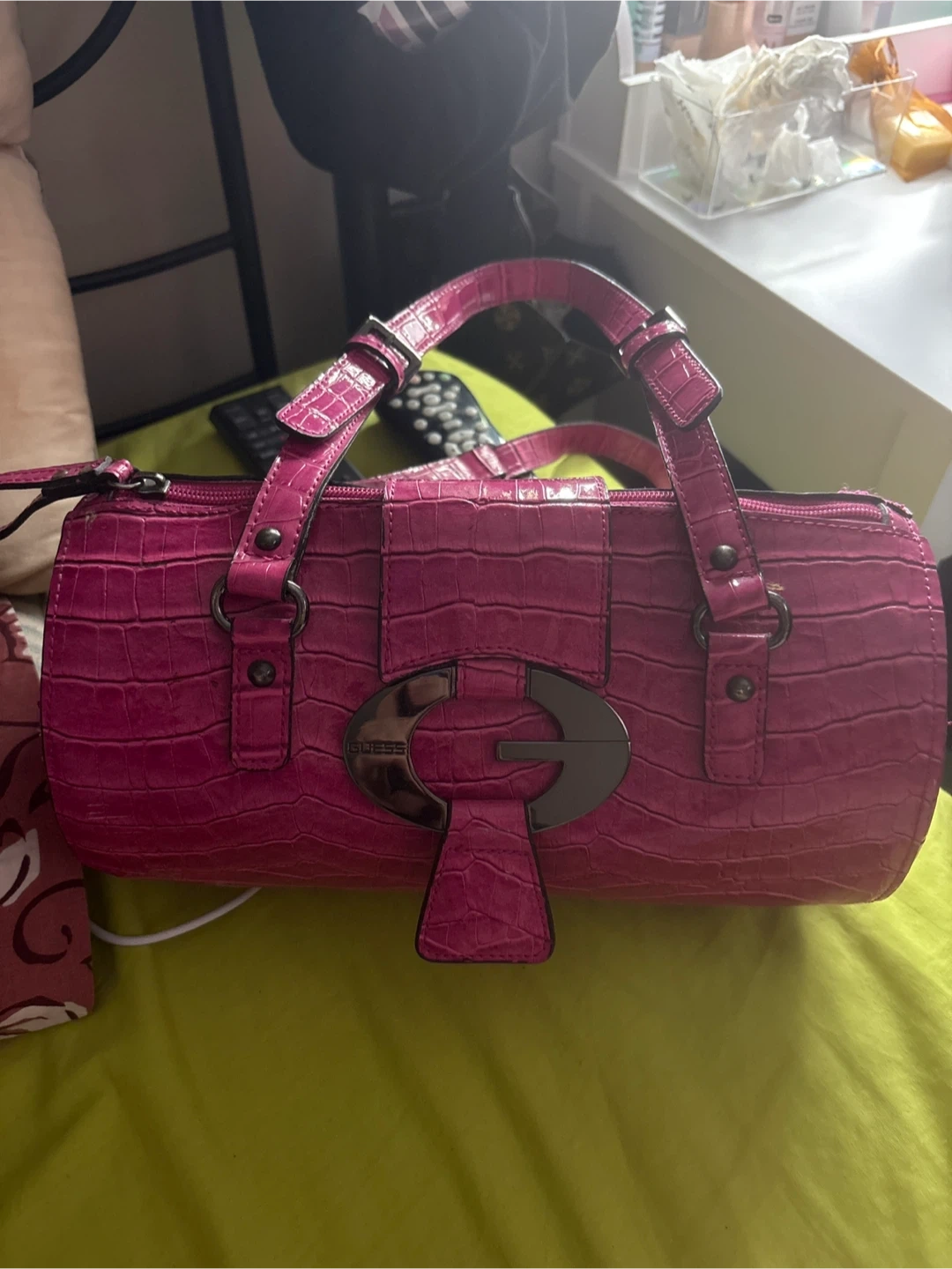 Selling a cute Guess barrel bag in a vibrant pink with a croc-embossed texture. It's in great shape and perfect for adding a pop of colour to any outfit! The bag features the iconic Guess logo.