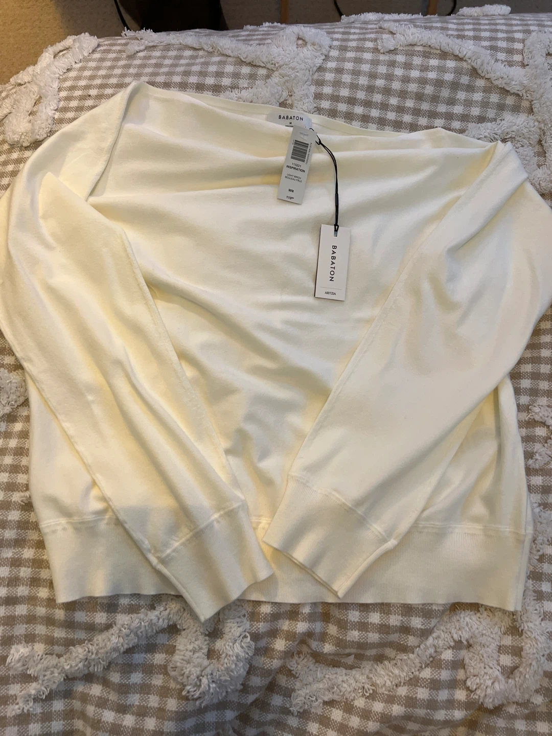 Selling a brand new Babaton Inspiration Sweater in light birch, size M! It's a relaxed open-neck sweater. Perfect for a casual yet stylish look!