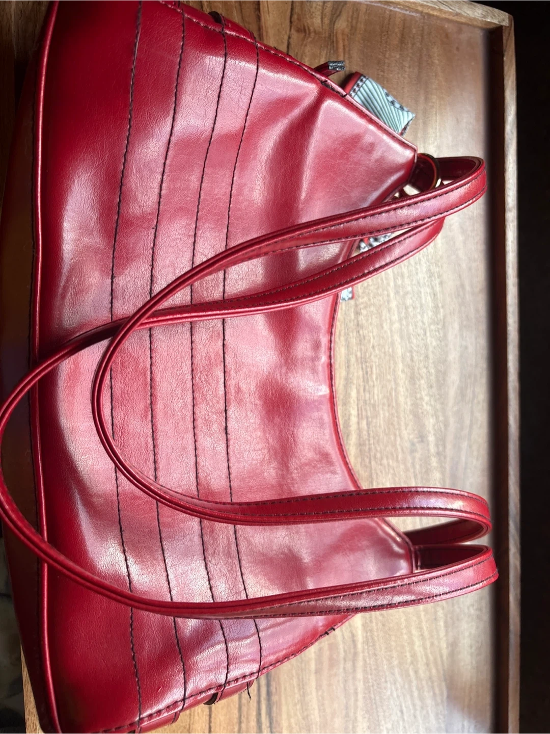 65A stylish red leather handbag, perfect for adding a pop of colour to your outfit! It comes with a cute patterned scarf tied to the handle, adding a touch of personality. The bag is in great condition and ready for a new home