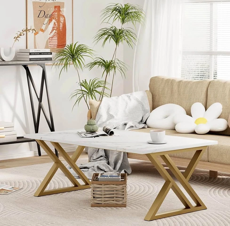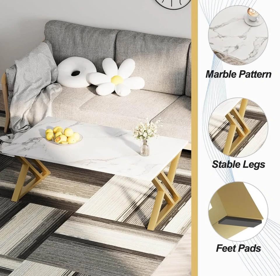 This rectangular coffee table has a faux composite board top with a marble grain and gold metal legs, showing the natural beauty of the coffee table with a modern design and simple structure. Classic white tables and high-quality materials can be paired with any style of room, simple and stylish.