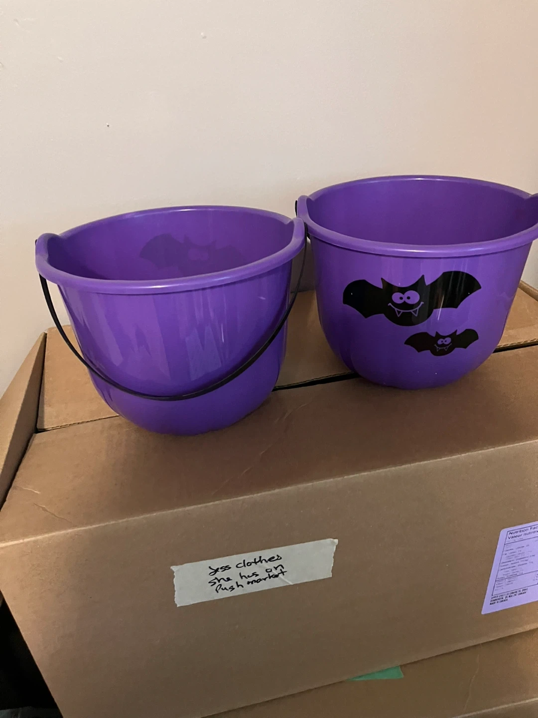 30Selling a set of two purple Halloween buckets! They're perfect for trick-or-treating or Halloween decorations. One bucket has a single bat design, while the other has a double bat design