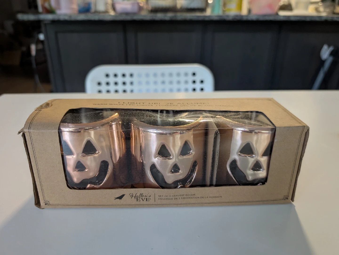 Warm white LED lights included. Add a touch of spooky charm to your home with this Hallow's Eve Harvest Decor set! This set includes three adorable pumpkin-shaped decorations, still brand new in the box. Perfect for adding a festive touch to your Halloween decor