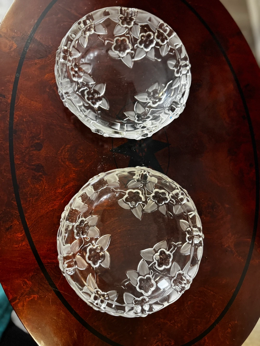 Two Glass Floral Ash Trays with a floral design around the edges. They are in good condition and would be perfect for serving small snacks or desserts or as ash trays