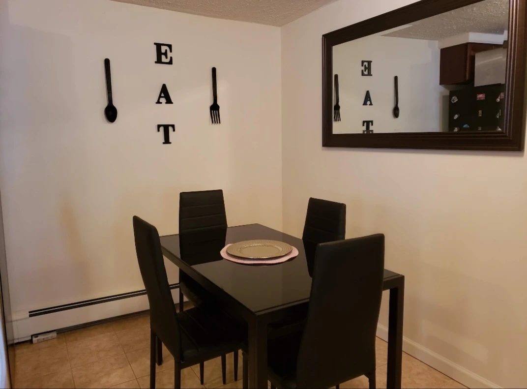 Selling a sleek black dining table with four matching chairs! The set is in great condition and would look perfect in any modern dining space. The actual color is black.
