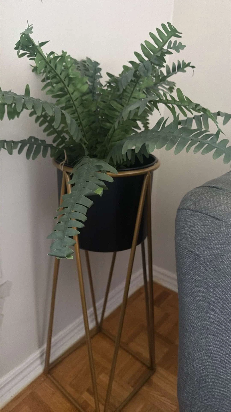 Selling a faux fern in a stylish black and gold planter. It's in great condition and adds a nice touch of greenery to any room! Perfect for adding a bit of life to your space without the hassle of watering