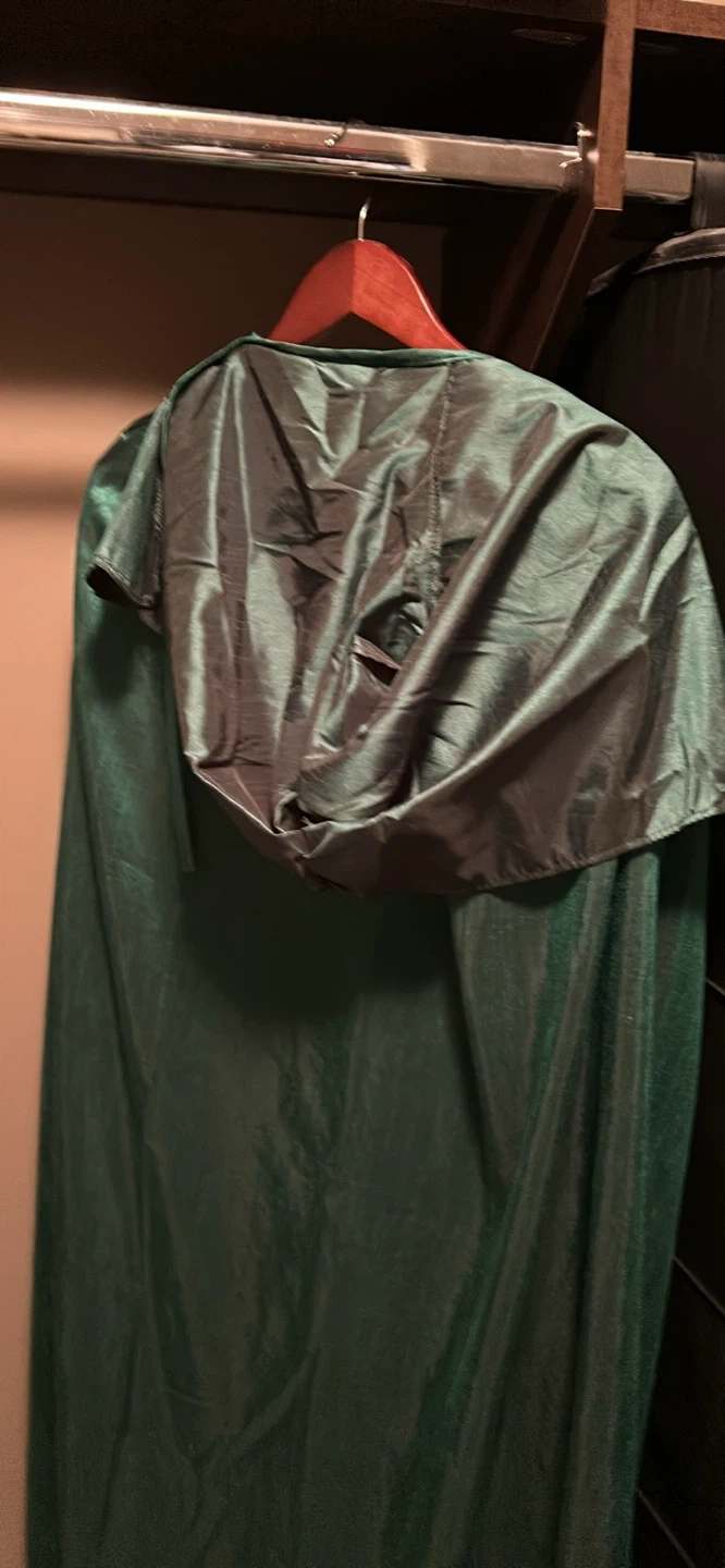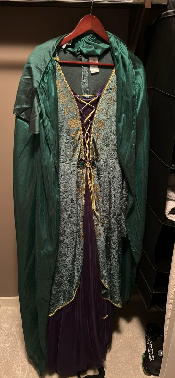 60Selling a beautiful renaissance-style dress in emerald green and purple! It features gold detailing and comes with a matching hooded cape. Perfect for costumes or themed events!